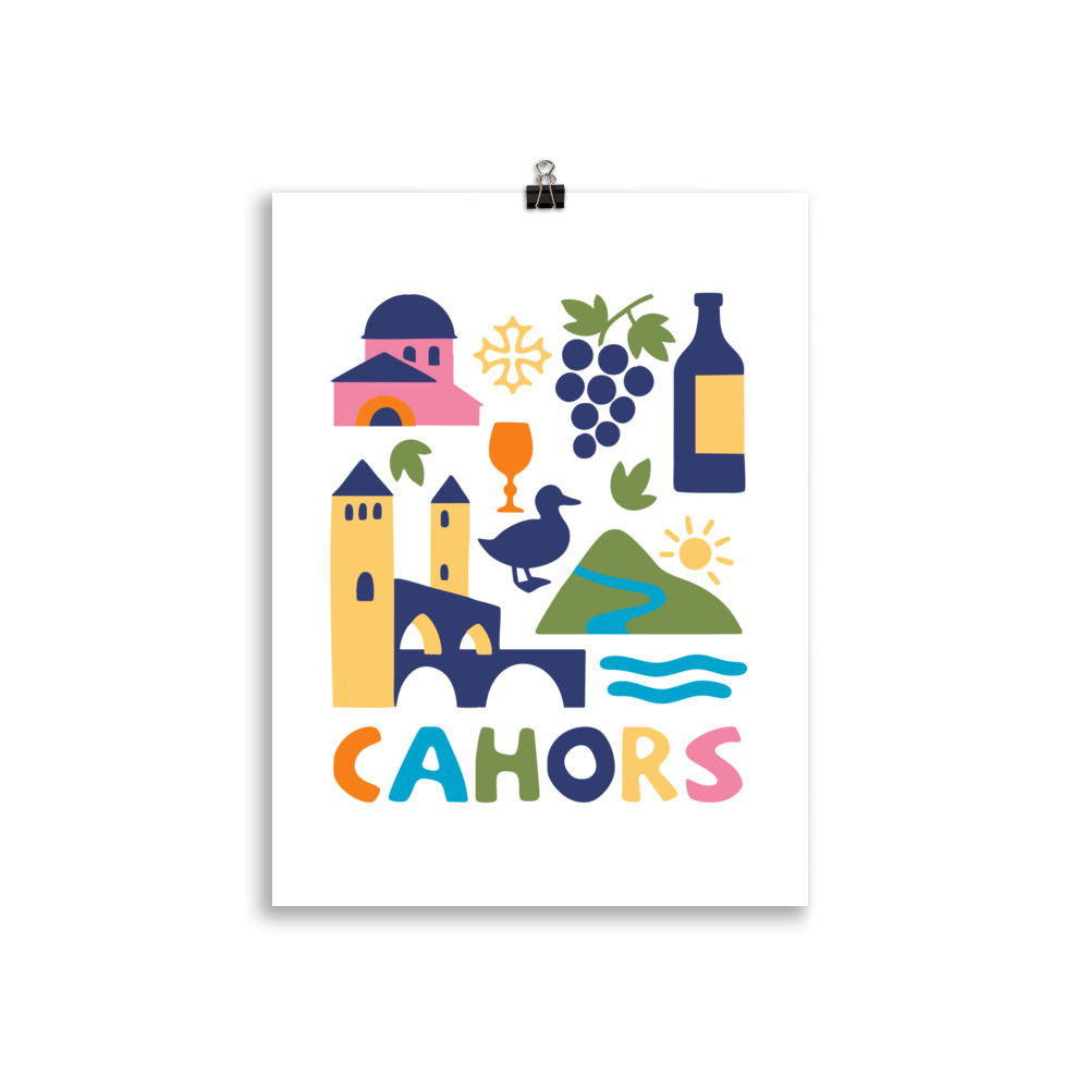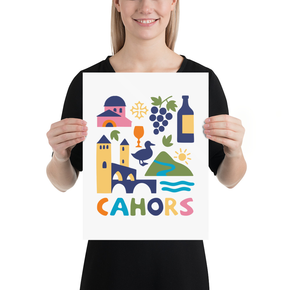 Joyeuse et dynamique, cette composition capture l’essence de Cahors : patrimoine, vin, nature et art de vivre, avec une touche de modernité.