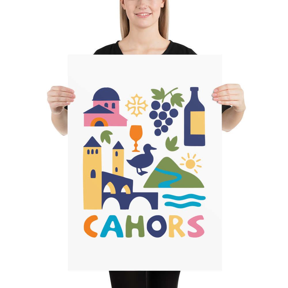 Ce visuel réunit les symboles emblématiques de Cahors dans un style épuré et coloré : Pont Valentré, vignobles de Malbec, croix occitane, gastronomie et paysages du Quercy. Les formes simples et les aplats de couleurs vives rappellent l’univers des illustrations contemporaines et des affiches minimalistes.