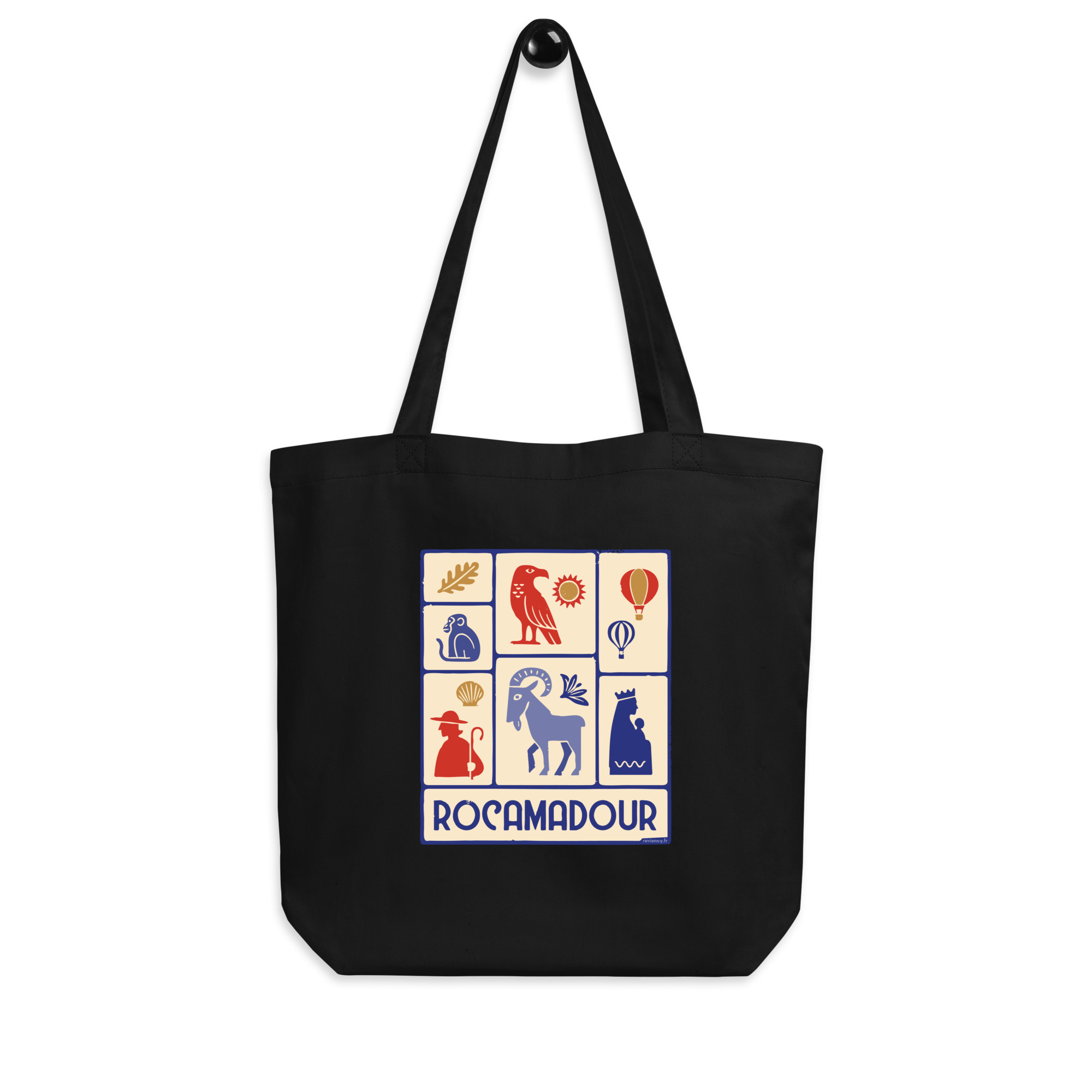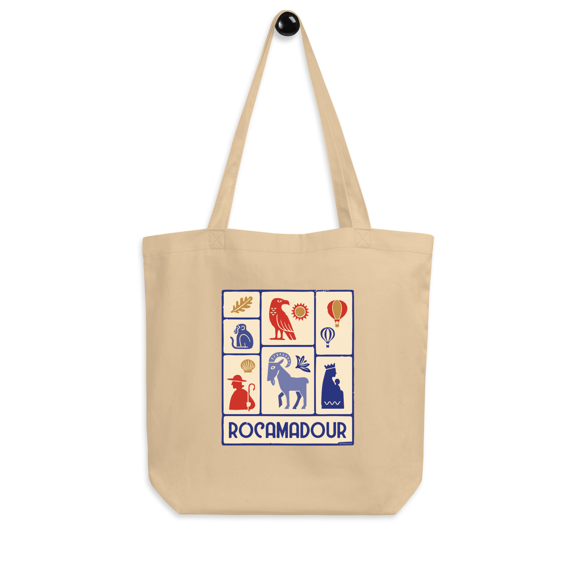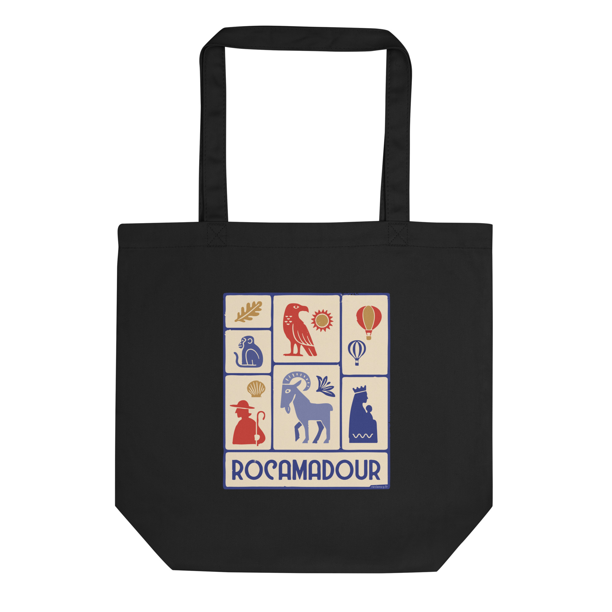 Ce visuel rassemble les symboles de Rocamadour (Lot, Occitanie) : pèlerin de Saint-Jacques-de-Compostelle, chèvre du Quercy, Vierge noire, singe de la Forêt des Singes, aigle du Rocher des Aigles et montgolfières des Montgolfiades. Composition inspirée des motifs artisanaux.