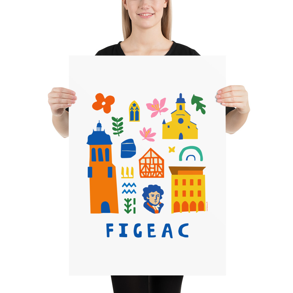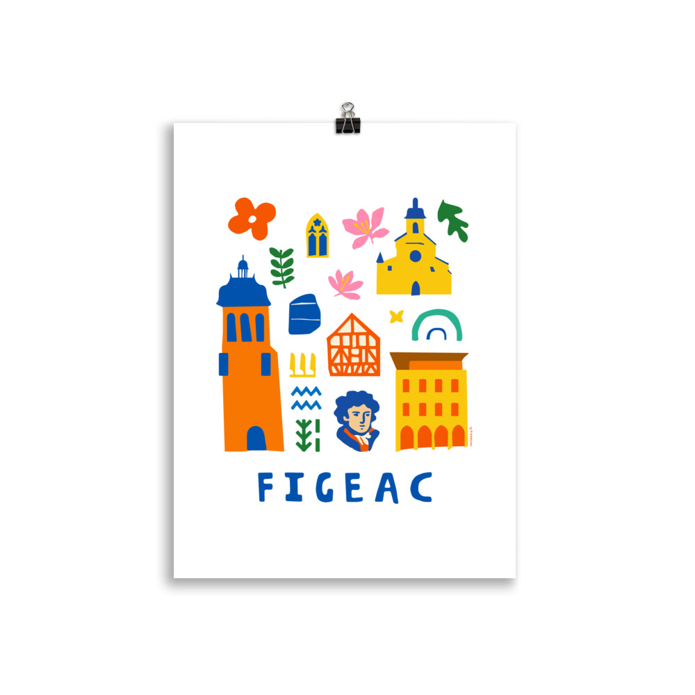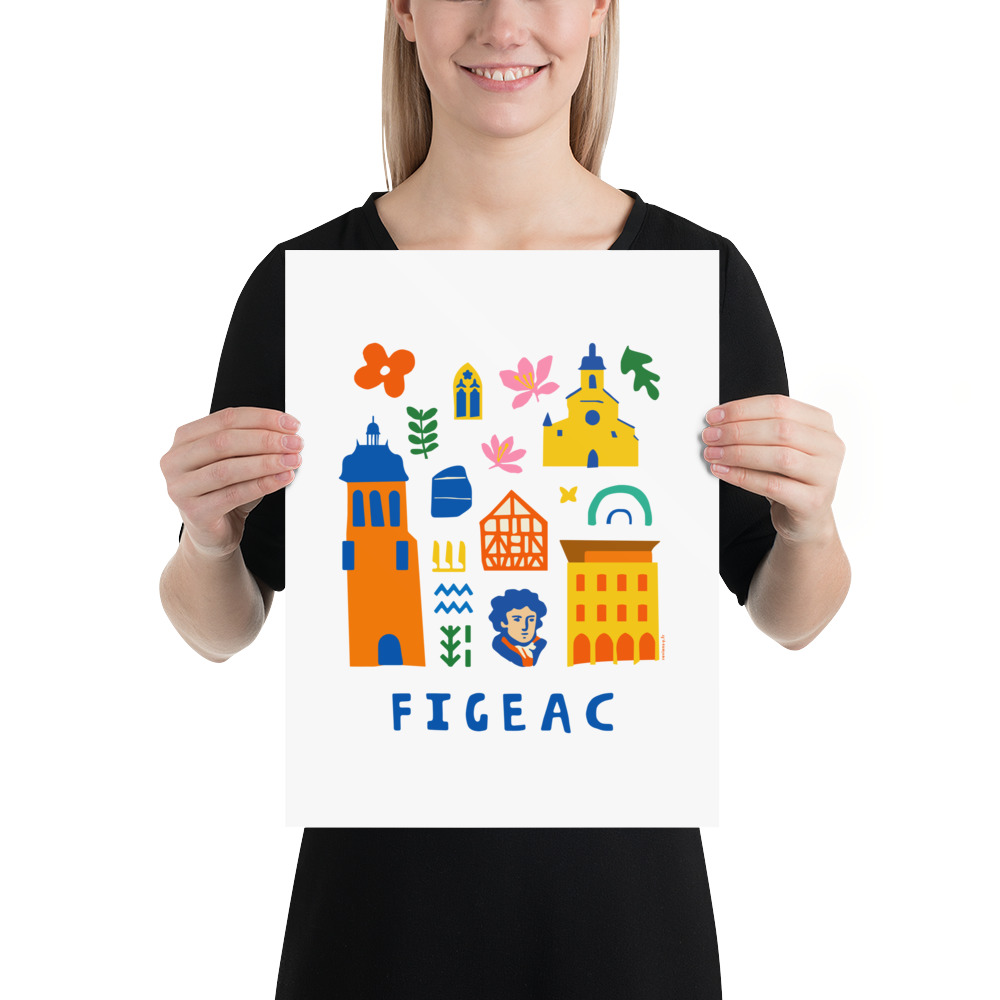 Explorez Figeac avec cette affiche au style folk art joyeux et moderne. Une composition originale en collage d’icônes colorées célébrant le patrimoine unique du Quercy : fleur de safran, feuille de chêne du causse, les incontournables Eglise Saint Sauveur et Église Notre-Dame-du-Puy, le Musée Champollion, la Pierre de Rosette, des hiéroglyphes et les maisons à colombages. Design aux formes simples et couleurs vives. Texte ‘FIGEAC’ en bas. Souvenir authentique.