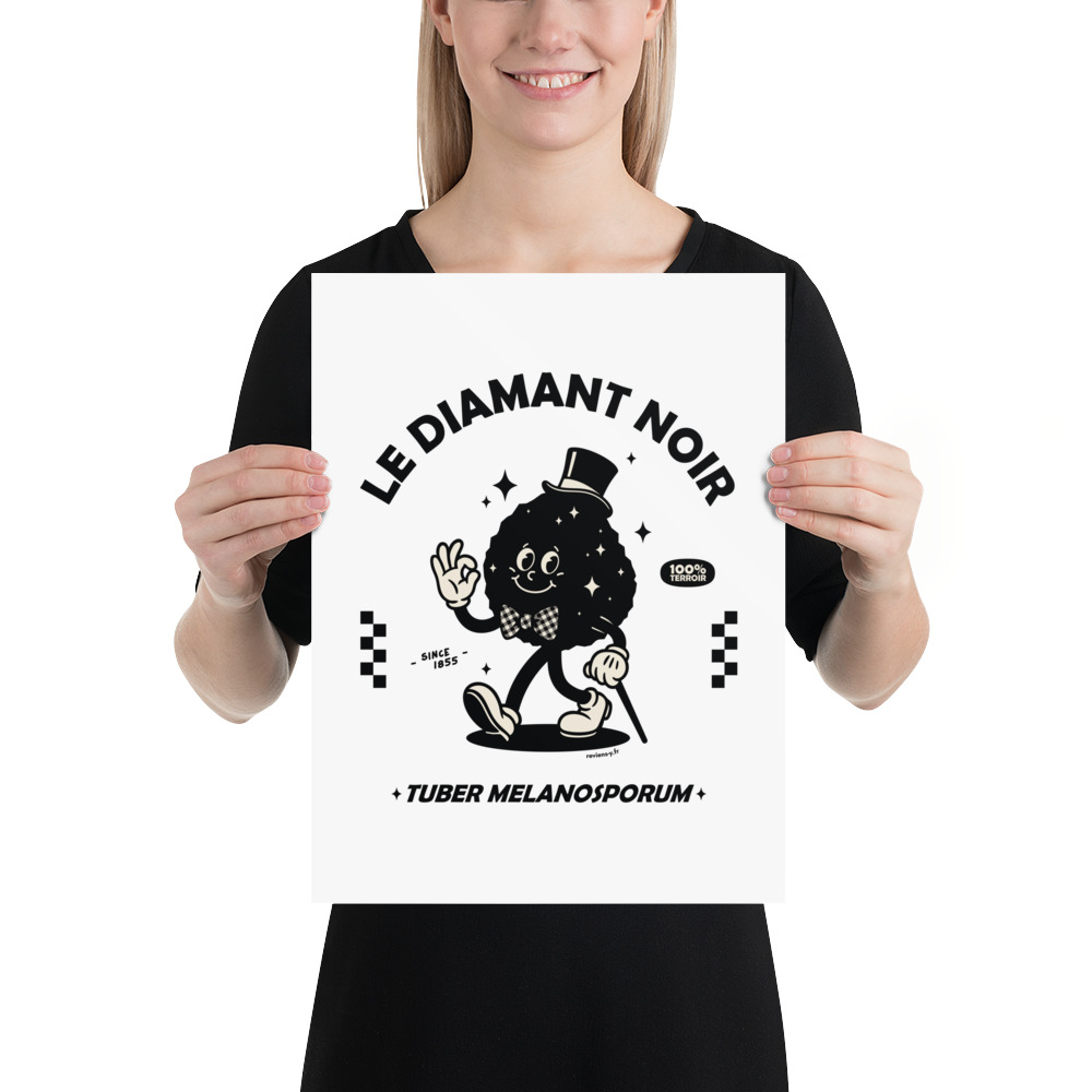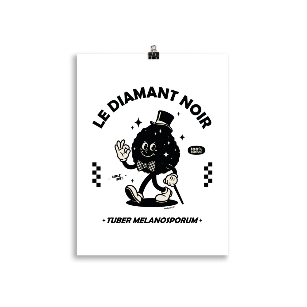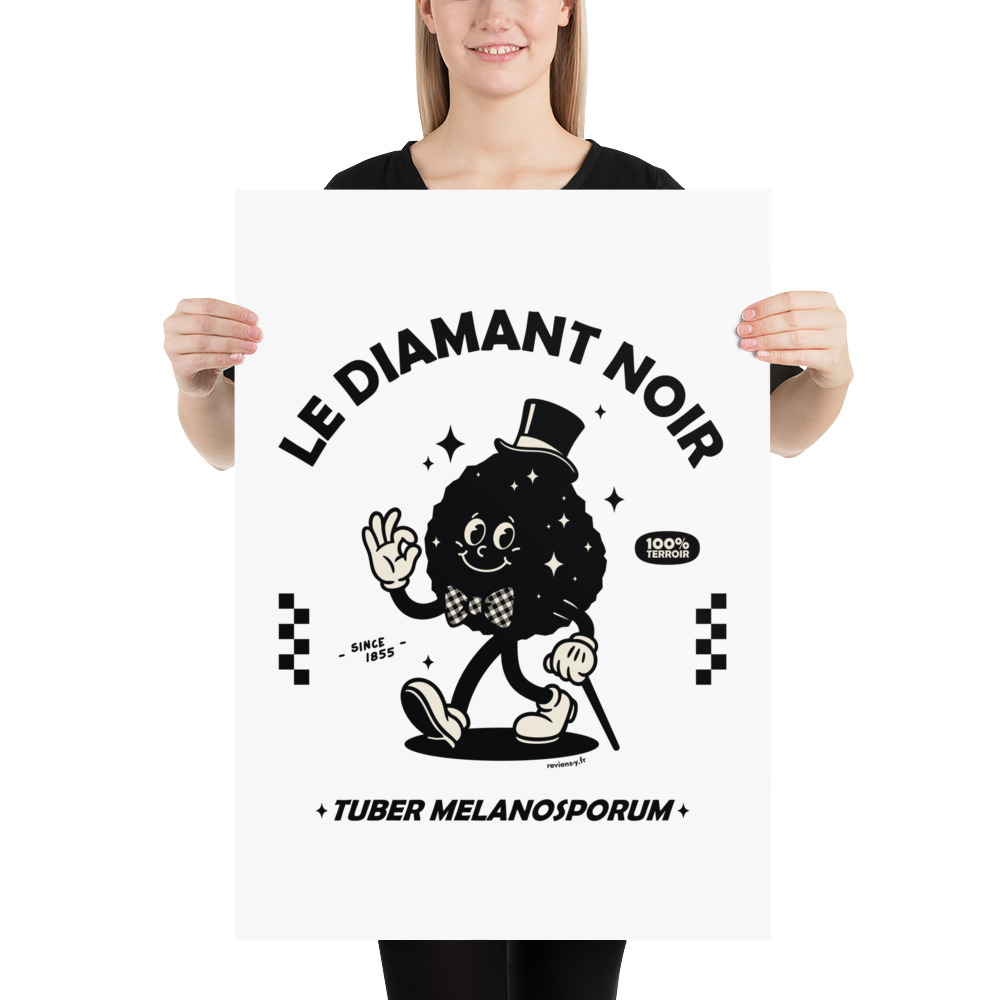 Ce design exclusif met en scène la Tuber Melanosporum sous les traits d’un personnage vintage au style soigné : haut-de-forme, canne et nœud papillon à motif vichy, clin d’œil à l’art de vivre à la française.
