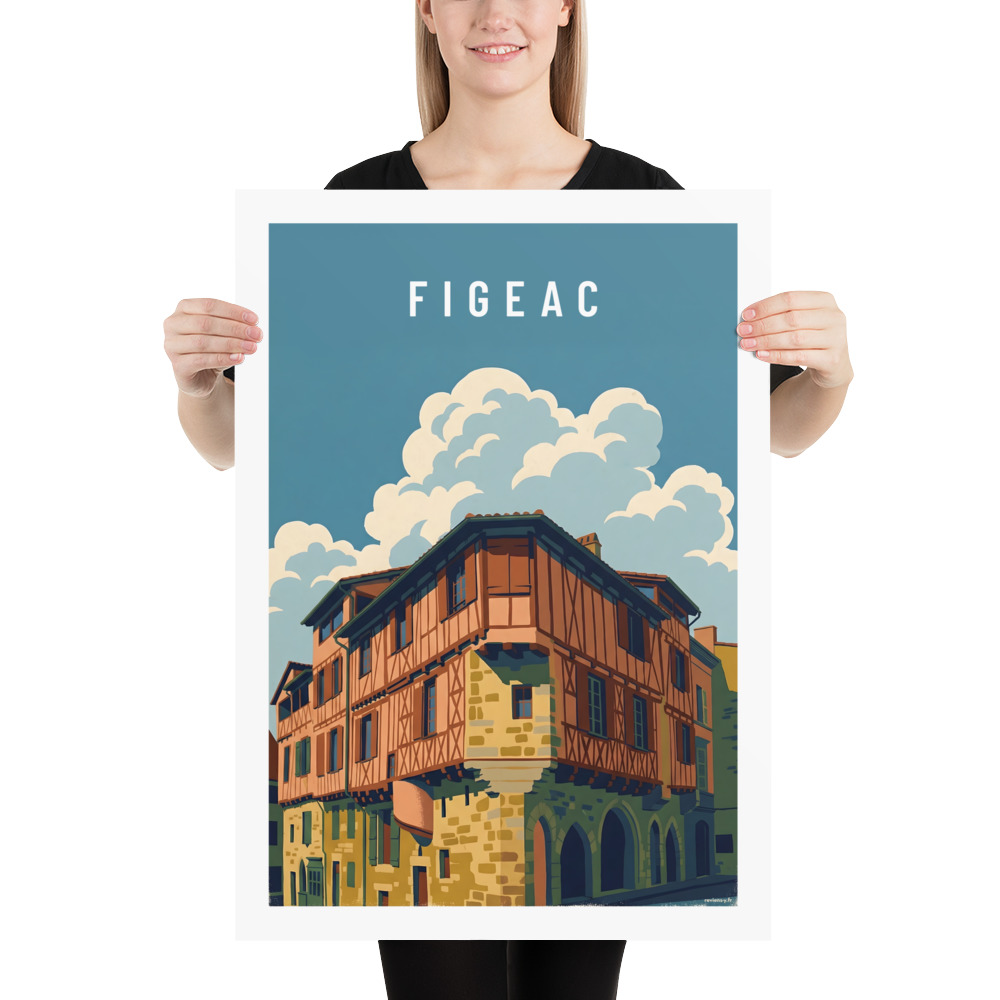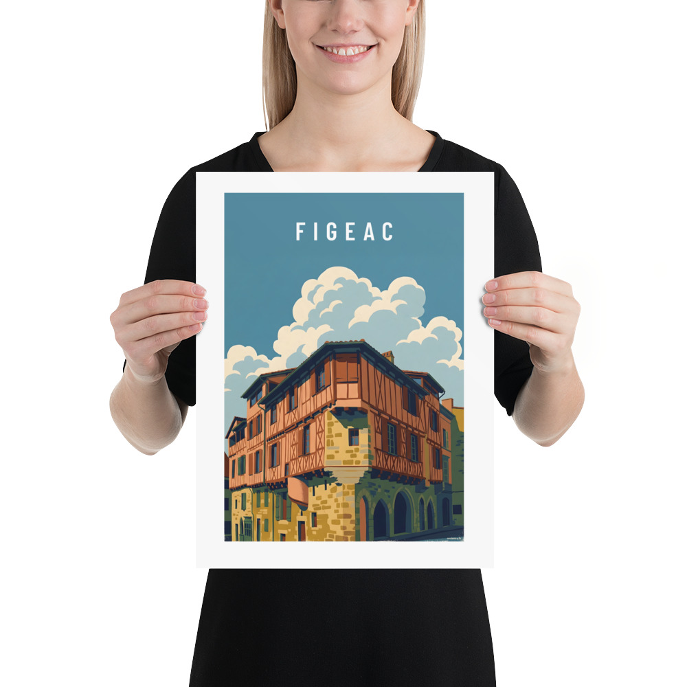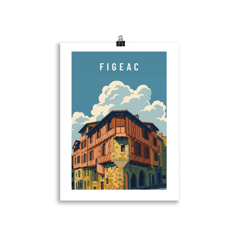 Illustration de Figeac au style graphique moderne, mettant en valeur une maison à colombages typique et l’architecture médiévale du Lot. Le traitement des formes et des couleurs souligne le relief, les matières et la lumière, offrant une interprétation contemporaine du patrimoine local.