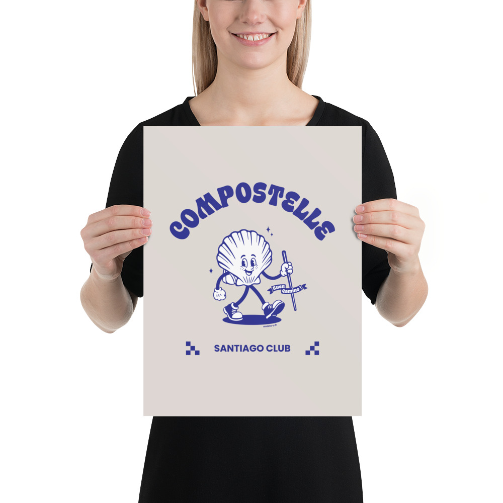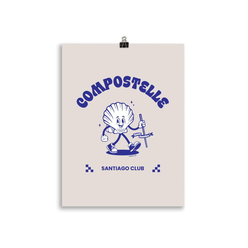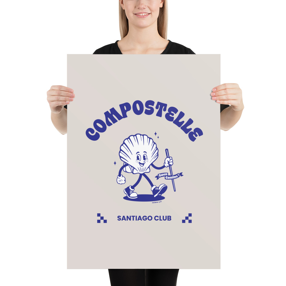 Craquez pour ce visuel rétro Compostelle ! Cette illustration vintage met en scène une adorable coquille Saint-Jacques mascotte en marche, arborant un style cartoon nostalgique. Avec son bâton de pèlerin et son joyeux message Buen Camino, ce design Santiago Club original célèbre le Chemin de Saint-Jacques avec une touche d’humour et d’authenticité.