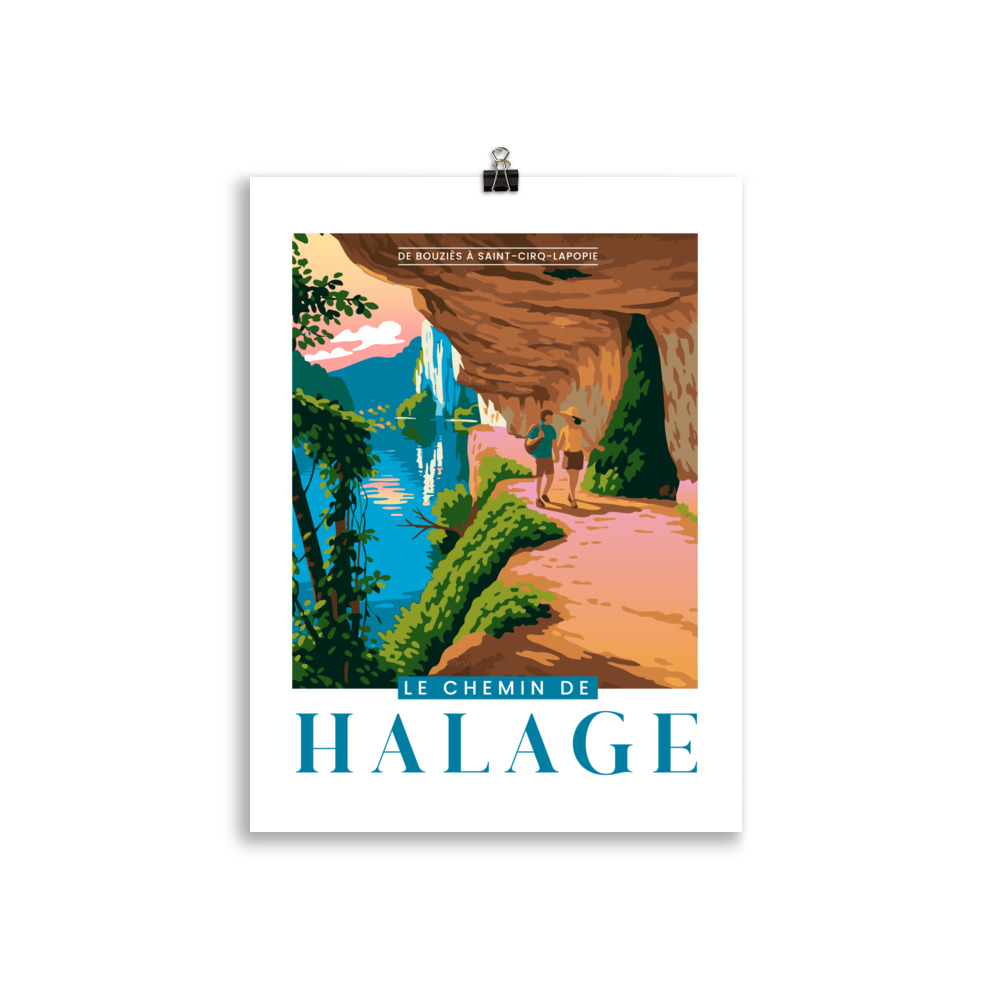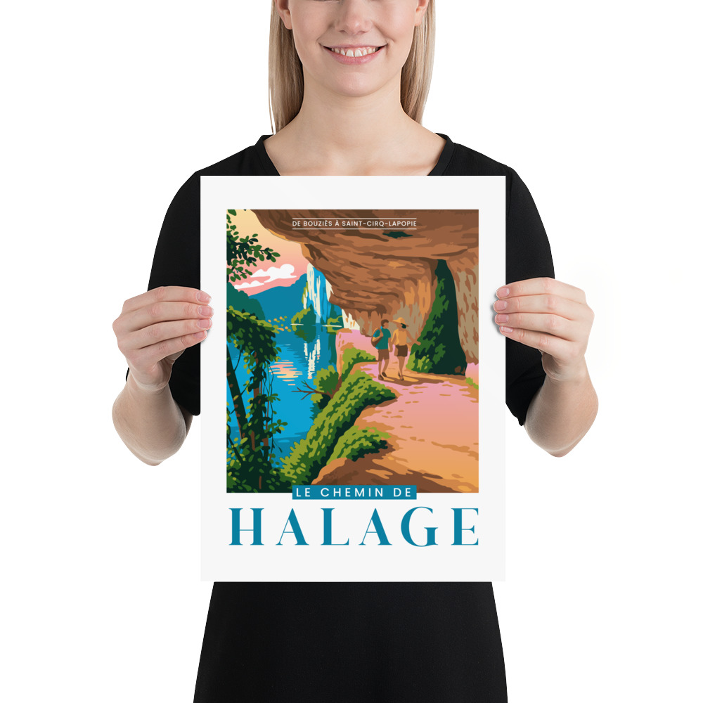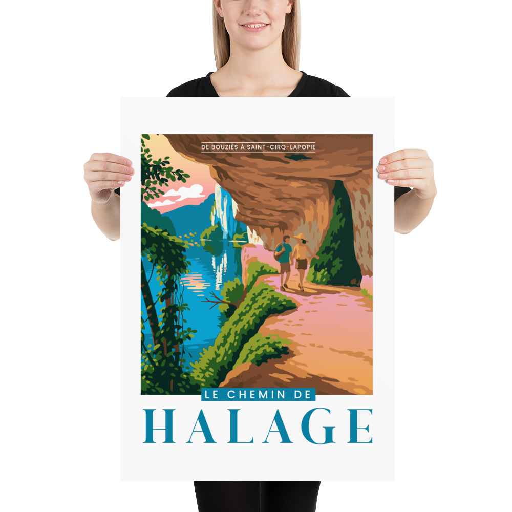 L’illustration met en lumière le célèbre chemin de halage, creusé dans la falaise au bord du Lot. On y voit deux randonneurs profiter de ce sentier unique, entre paroi rocheuse sculptée et reflets colorés de la rivière. La scène évoque une promenade immersive, où nature et patrimoine se rencontrent.
