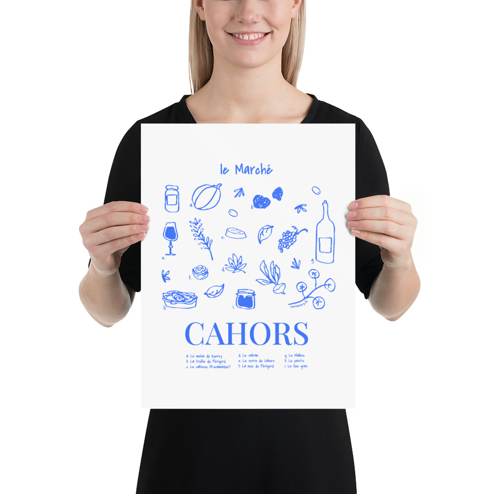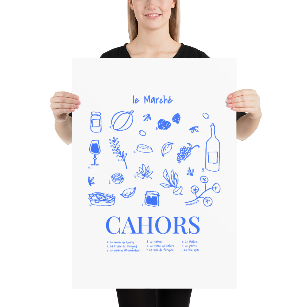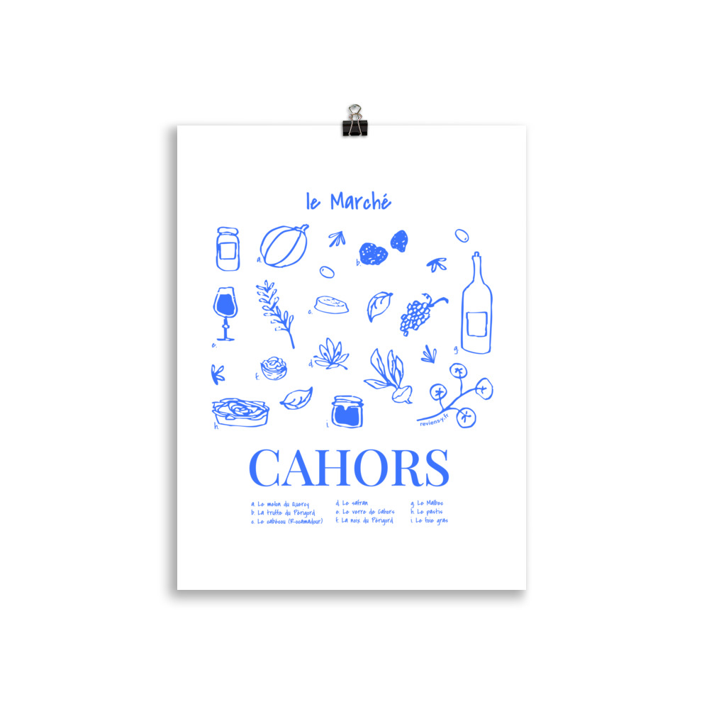 Ce visuel met à l’honneur les produits emblématiques du marché de Cahors et du Quercy. Illustrés dans un style graphique simple et monochrome, on y retrouve le melon du Quercy, la truffe du Périgord, le cabécou de Rocamadour, le safran, le verre de Cahors, la noix du Périgord, le Malbec, le pastis et le foie gras.
