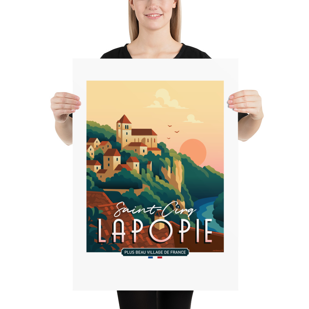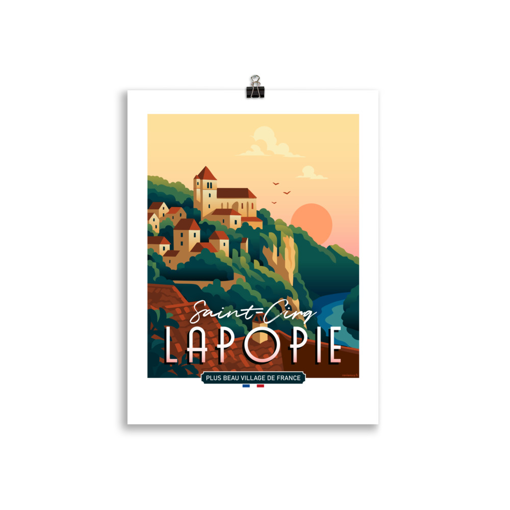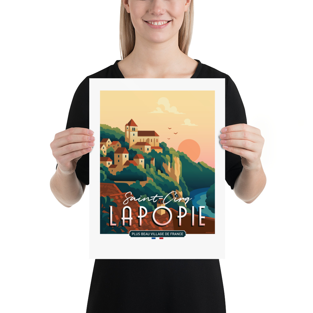 Le style mêle modernité et inspiration rétro, jouant sur des aplats de couleurs et des lignes épurées. Un design qui transforme le paysage en image iconique, fidèle à l’identité de Saint-Cirq-Lapopie et facilement reconnaissable.