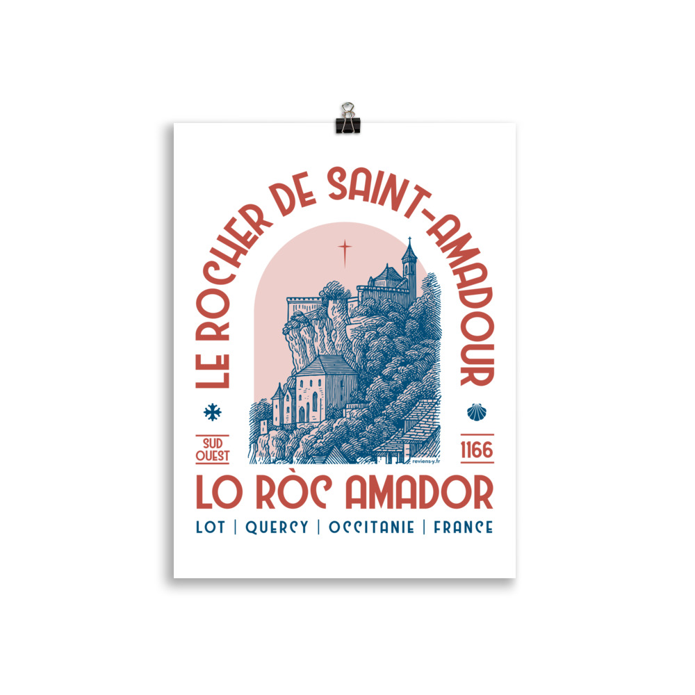 Ce visuel rend hommage au Rocher de Saint-Amadour, haut lieu spirituel de Rocamadour. Inspiré des gravures anciennes, il illustre les sanctuaires suspendus à la falaise, cœur du Lot et du Sud-Ouest. On y retrouve les symboles du Quercy, du pèlerinage et l’année 1166, date fondatrice du site.