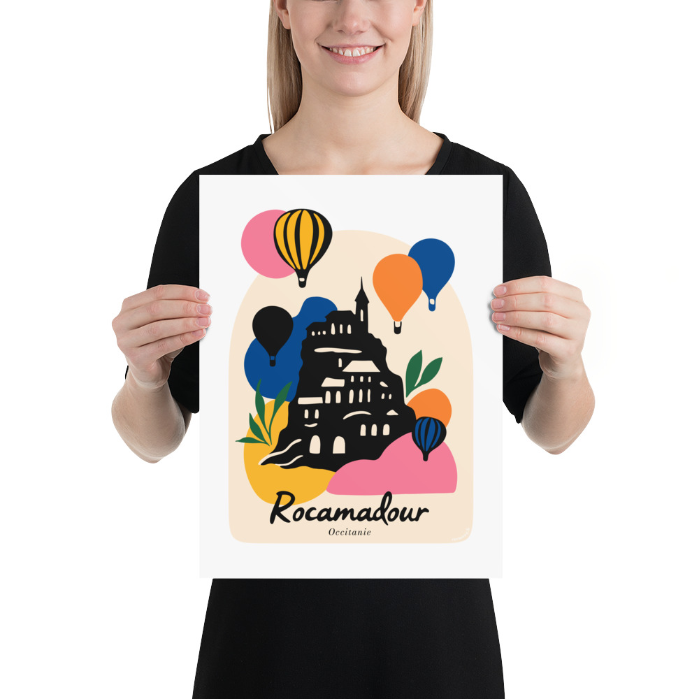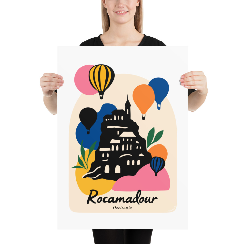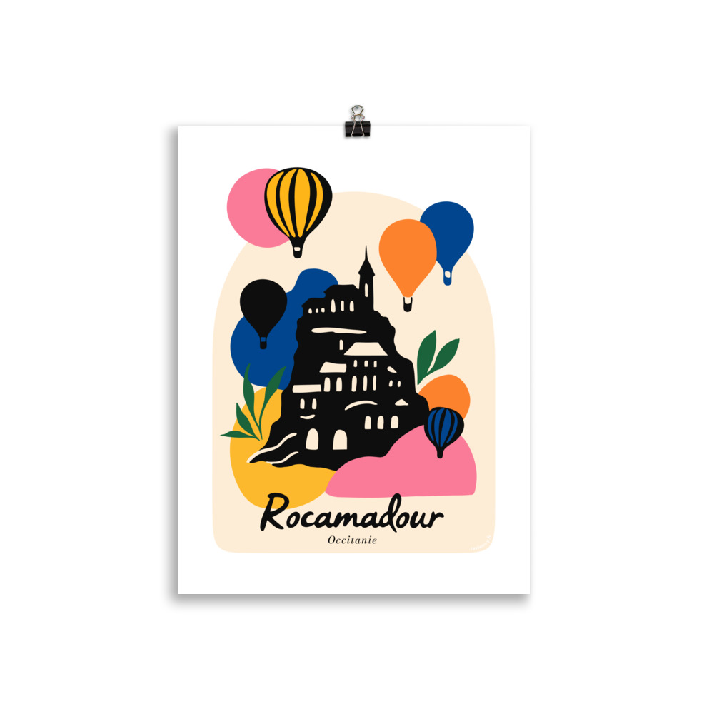 Ce visuel revisite Rocamadour dans une version colorée et contemporaine. La silhouette du village se détache sur un ciel animé de montgolfières, clin d’œil aux Montgolfiades qui illuminent chaque année le ciel du Lot. Les formes organiques et les teintes vives évoquent la vitalité du Sud-Ouest.