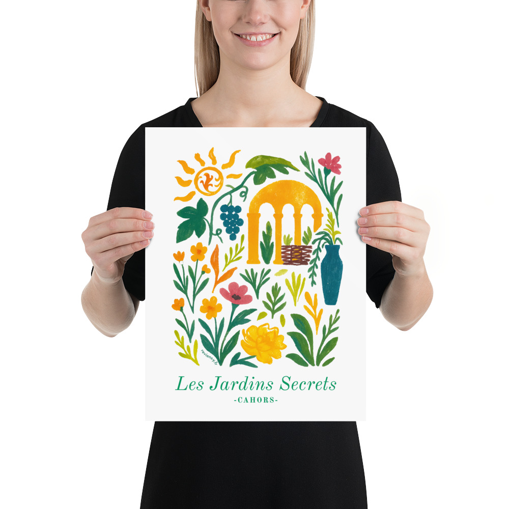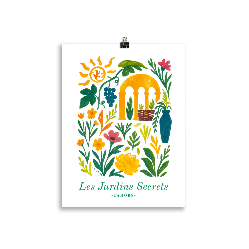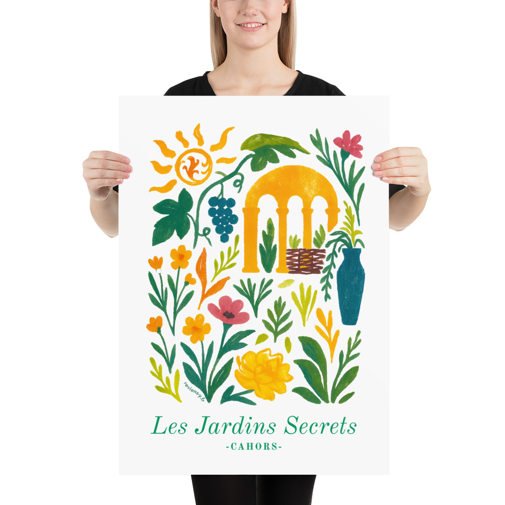 Ce visuel coloré rend hommage aux Jardins Secrets de Cahors, un parcours créé en 2002 qui regroupe plus de vingt jardins thématiques au cœur du centre historique. Signalés par des feuilles d’acanthe dans les rues, ils invitent à une promenade mêlant patrimoine médiéval et botanique.