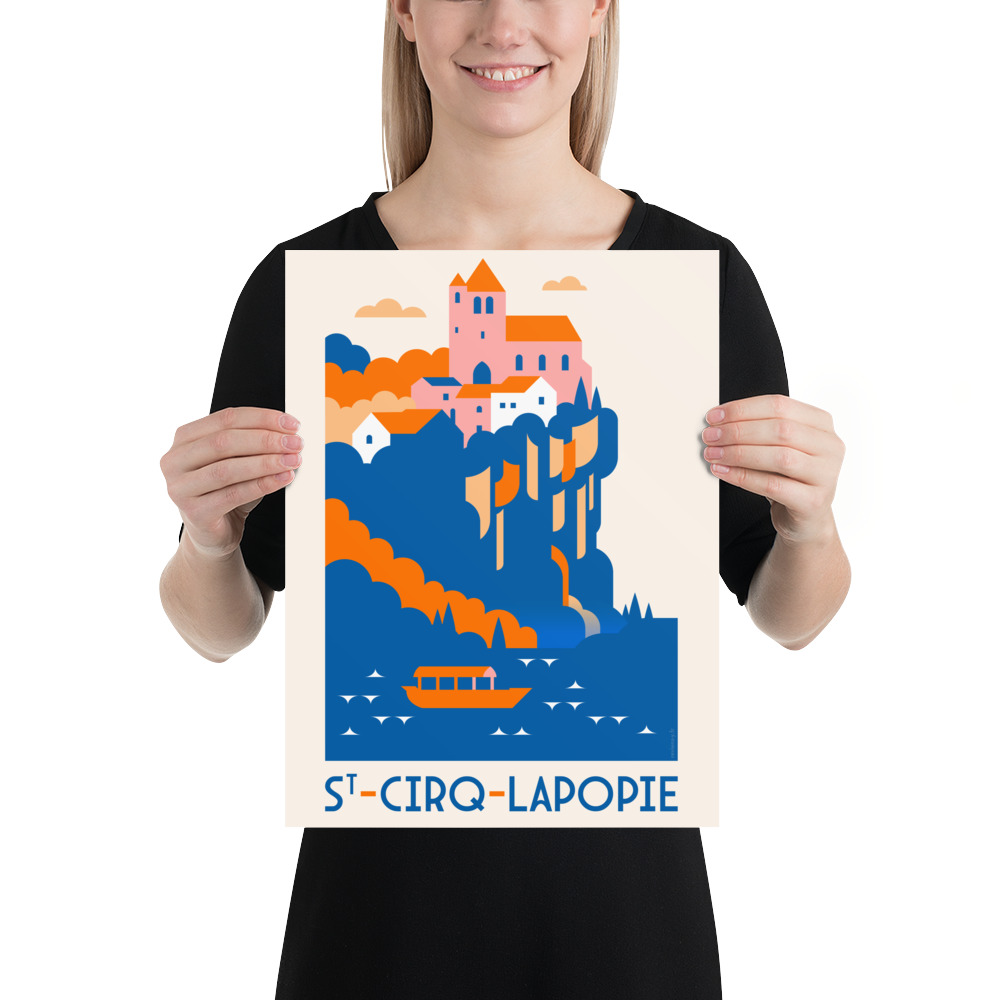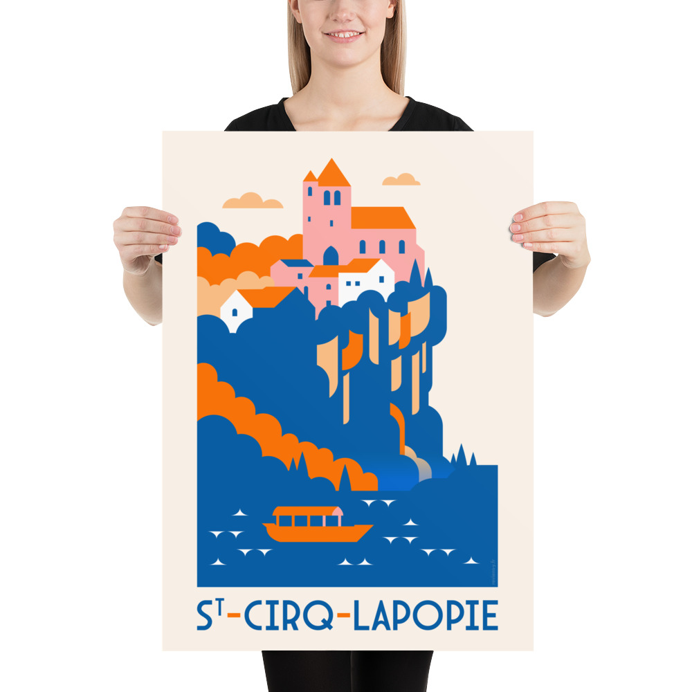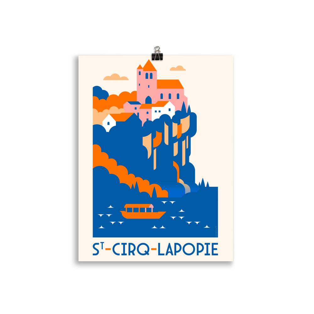 Ce visuel illustre Saint-Cirq-Lapopie dans une composition graphique minimaliste et colorée. Les falaises, la rivière et les maisons se dessinent en aplats contrastés, donnant une vision contemporaine d’un des plus beaux villages de France. La barque sur le Lot rappelle la vie fluviale et l’harmonie entre nature et architecture.