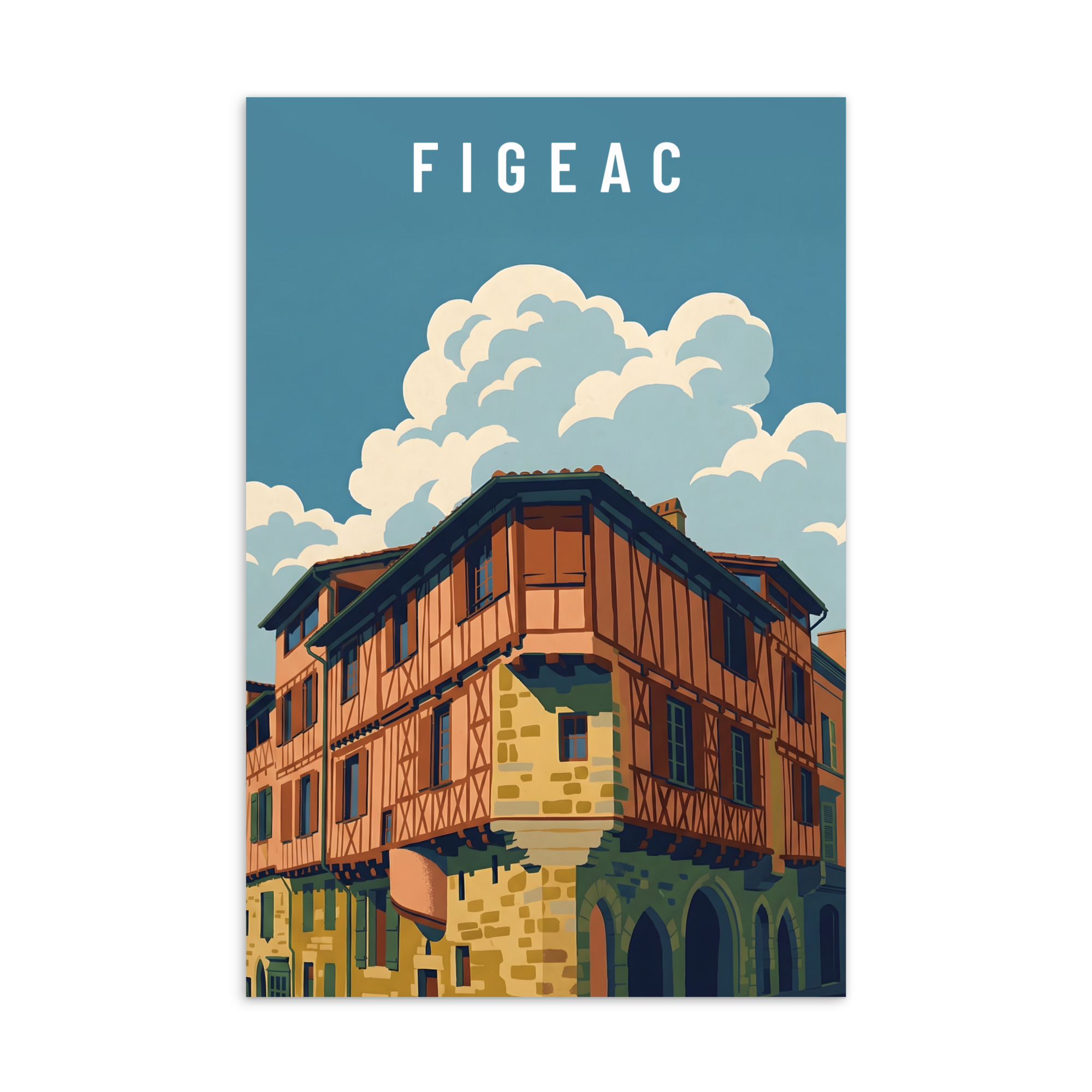 Illustration de Figeac au style graphique moderne, mettant en valeur une maison à colombages typique et l’architecture médiévale du Lot. Le traitement des formes et des couleurs souligne le relief, les matières et la lumière, offrant une interprétation contemporaine du patrimoine local.