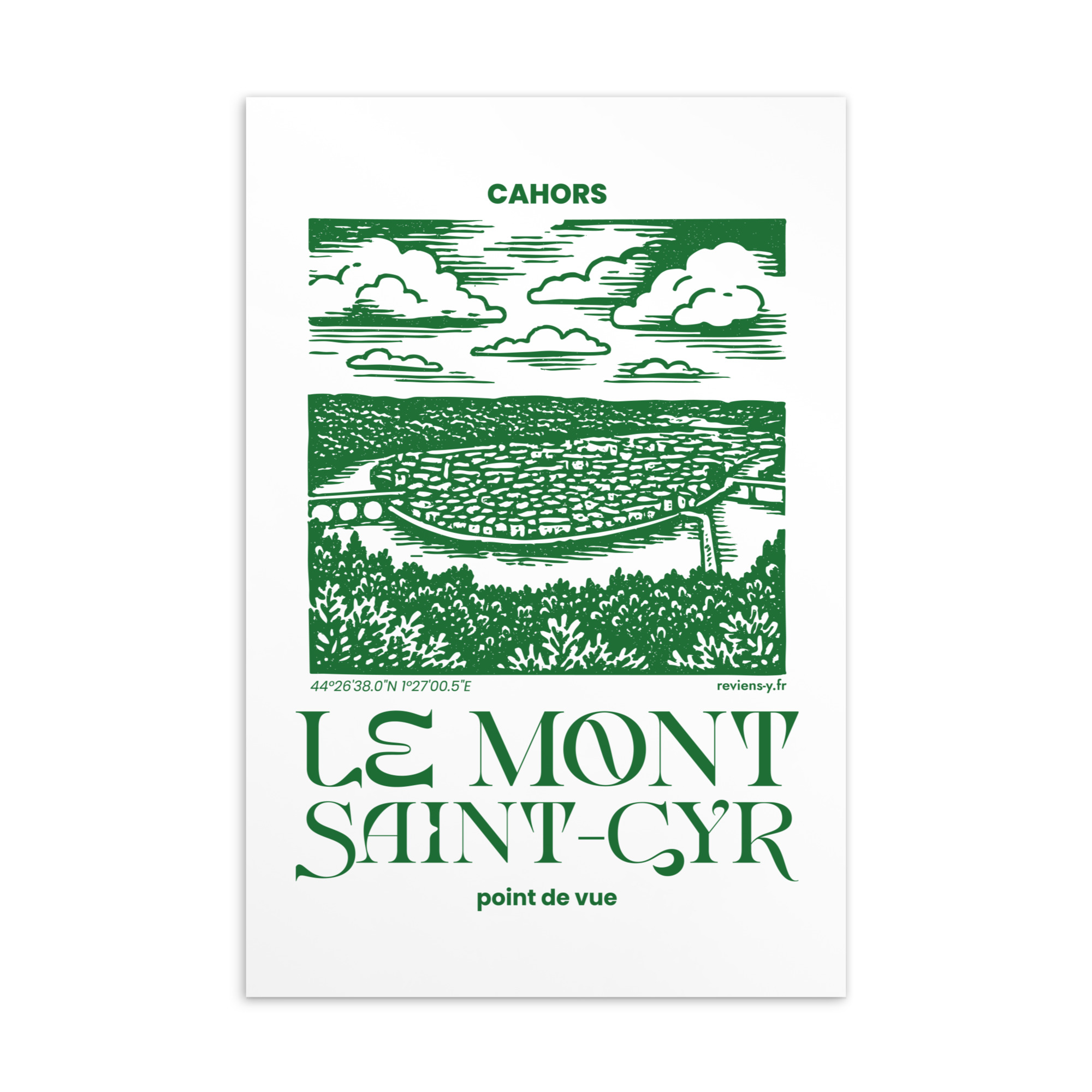 Ce visuel illustre l’un des panoramas les plus connus de Cahors : la vue depuis le Mont Saint-Cyr. On y découvre la boucle du Lot entourant la ville, captée dans un style graphique inspiré des gravures anciennes. Les détails du paysage, des ponts et de l’urbanisme cadurcien sont mis en valeur par un tracé fin et une teinte verte qui évoque la nature environnante.