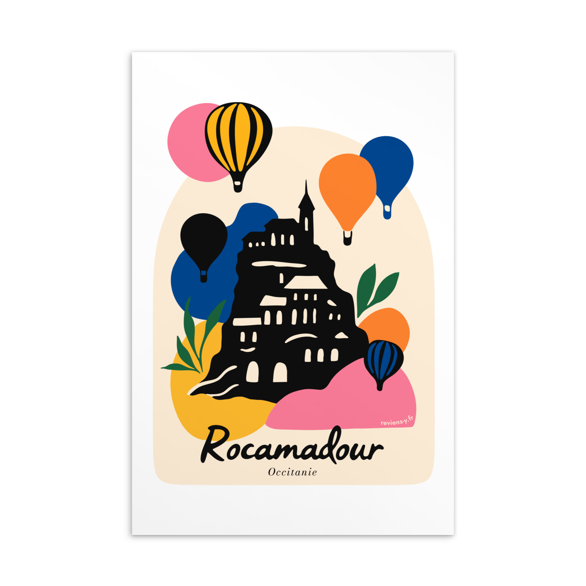 Ce visuel revisite Rocamadour dans une version colorée et contemporaine. La silhouette du village se détache sur un ciel animé de montgolfières, clin d’œil aux Montgolfiades qui illuminent chaque année le ciel du Lot. Les formes organiques et les teintes vives évoquent la vitalité du Sud-Ouest.
