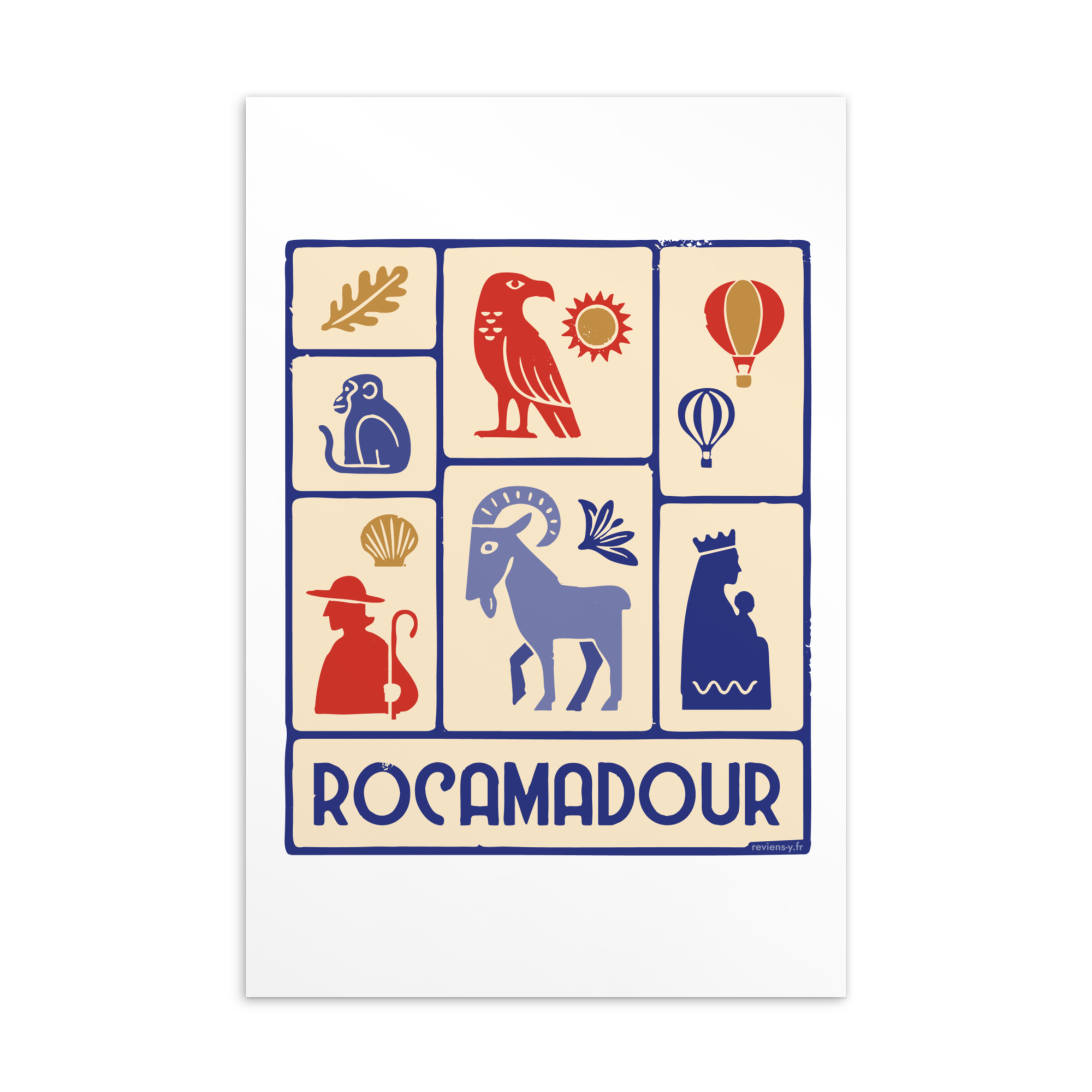 Ce visuel rassemble les symboles de Rocamadour (Lot, Occitanie) : pèlerin de Saint-Jacques-de-Compostelle, chèvre du Quercy, Vierge noire, singe de la Forêt des Singes, aigle du Rocher des Aigles et montgolfières des Montgolfiades. Composition inspirée des motifs artisanaux.