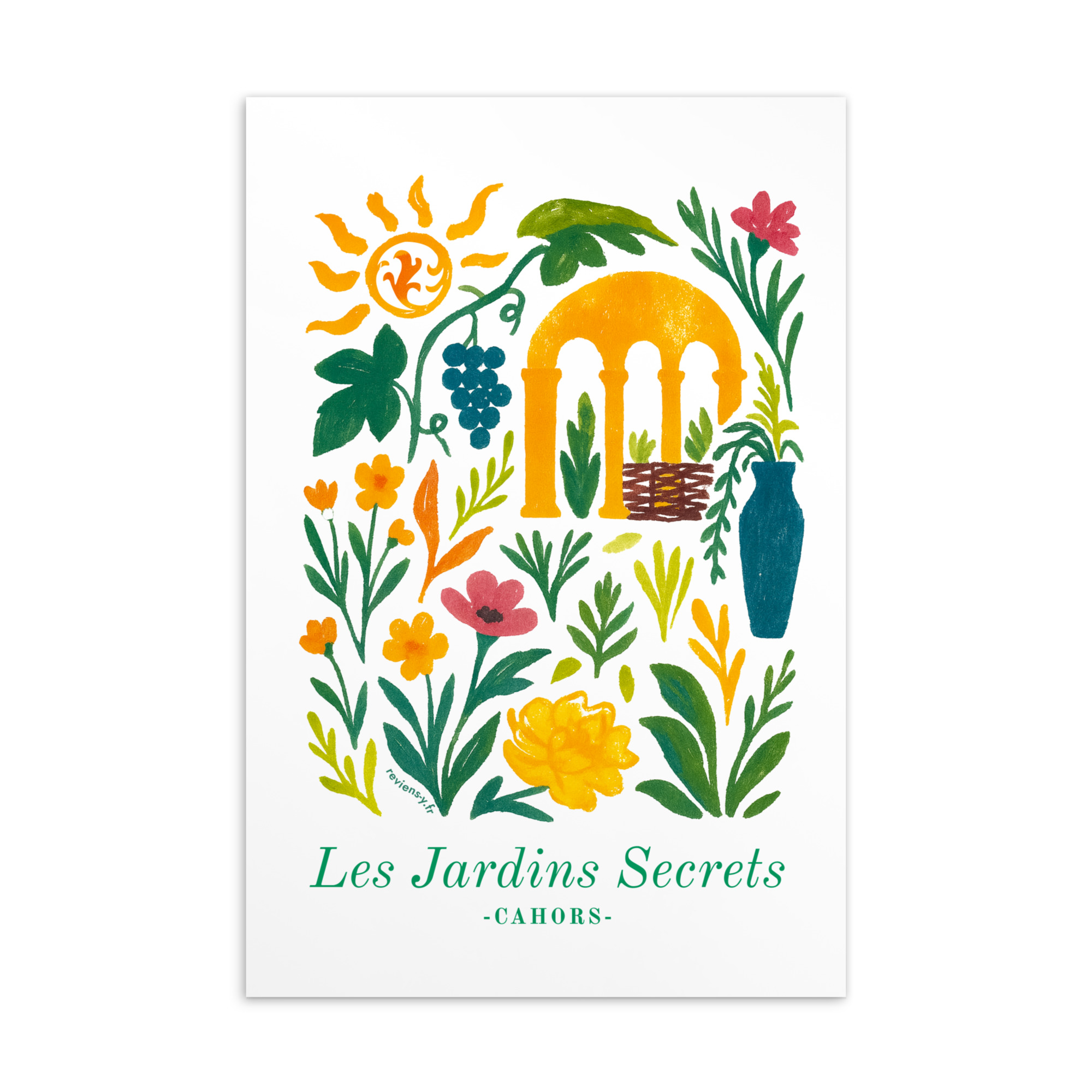 Ce visuel coloré rend hommage aux Jardins Secrets de Cahors, un parcours créé en 2002 qui regroupe plus de vingt jardins thématiques au cœur du centre historique. Signalés par des feuilles d’acanthe dans les rues, ils invitent à une promenade mêlant patrimoine médiéval et botanique.