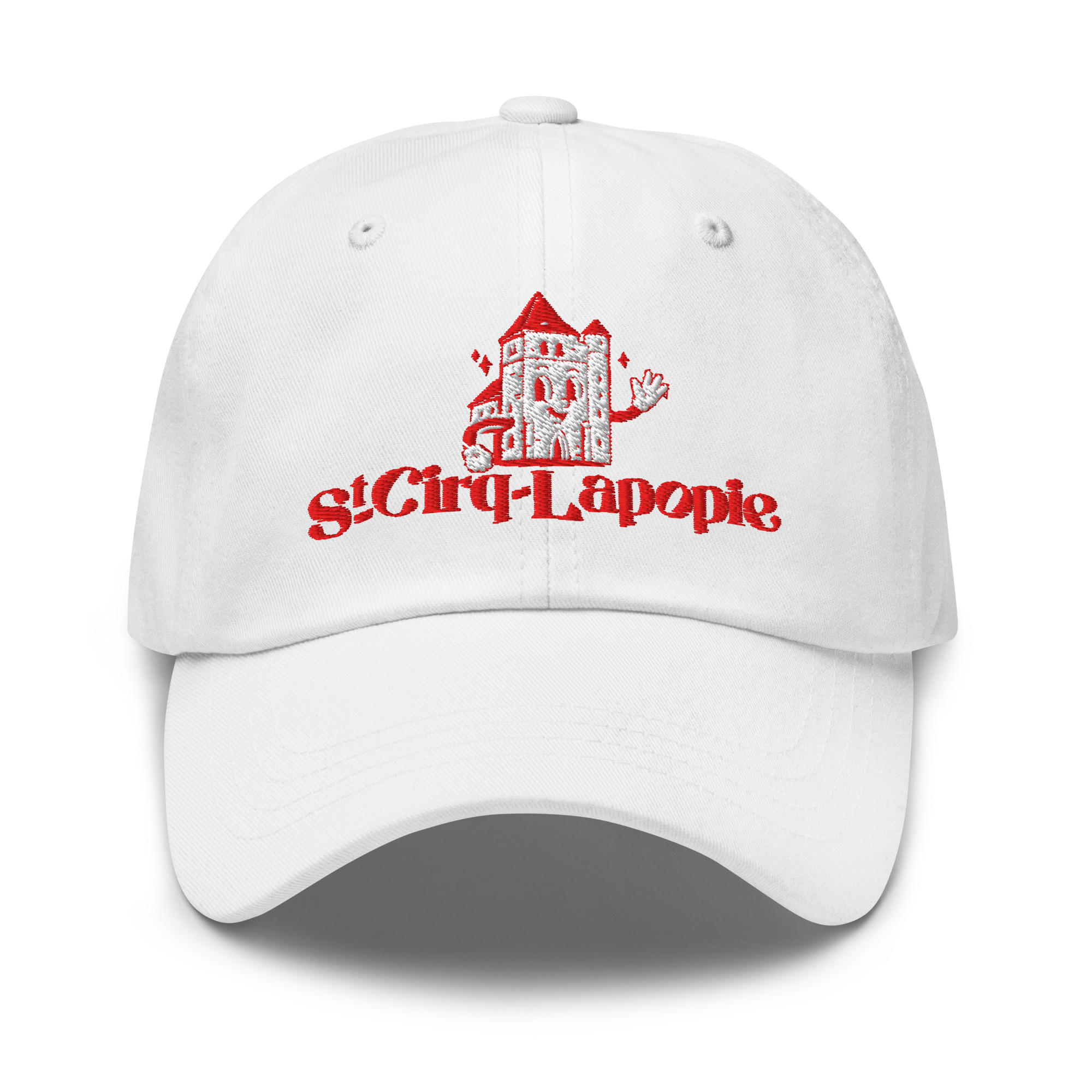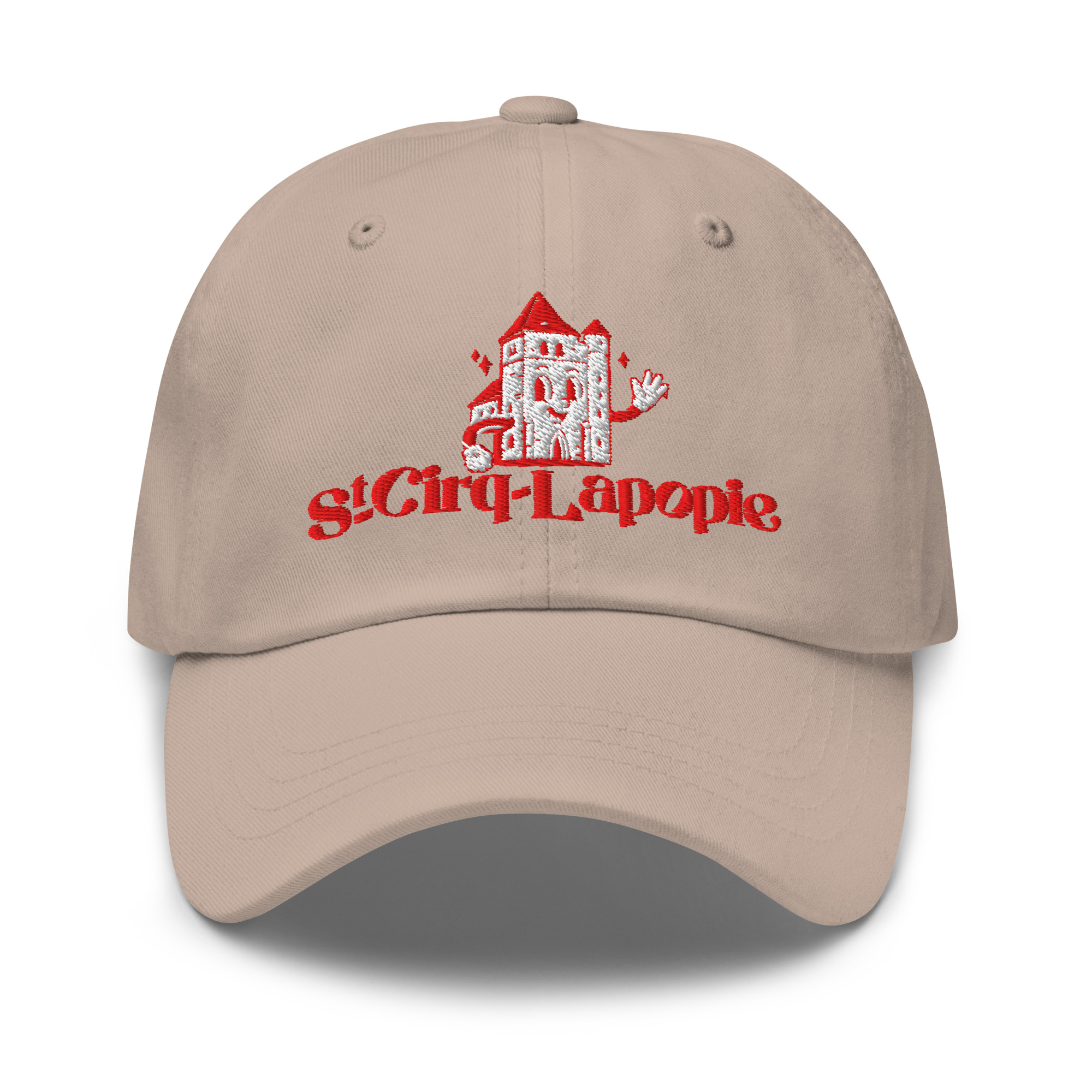 Ce visuel illustre l’église perchée de Saint-Cirq-Lapopie sous une forme ludique et vivante. Transformée en personnage souriant, elle prend vie avec des bras et des jambes en mouvement, offrant une interprétation originale et moderne d’un monument emblématique.