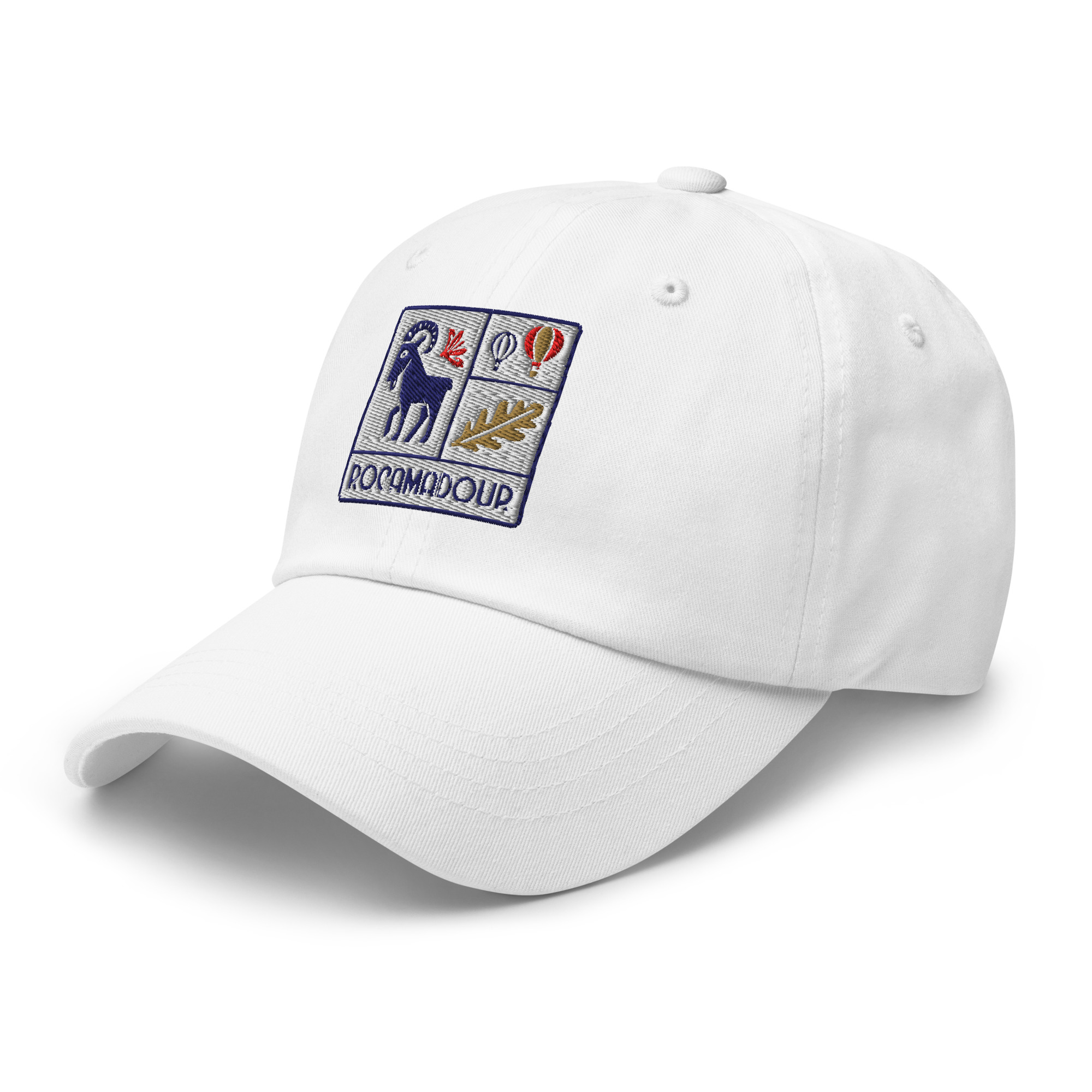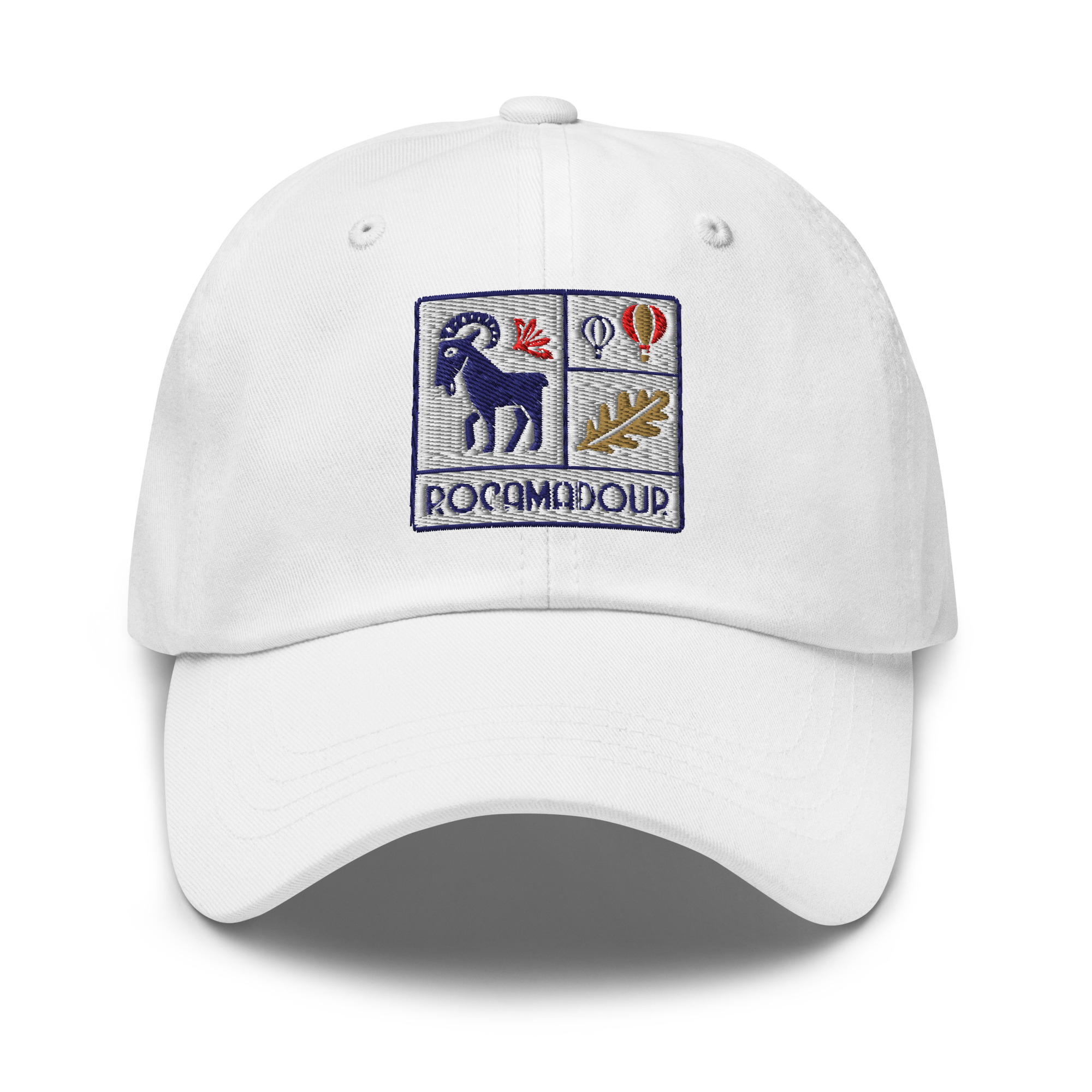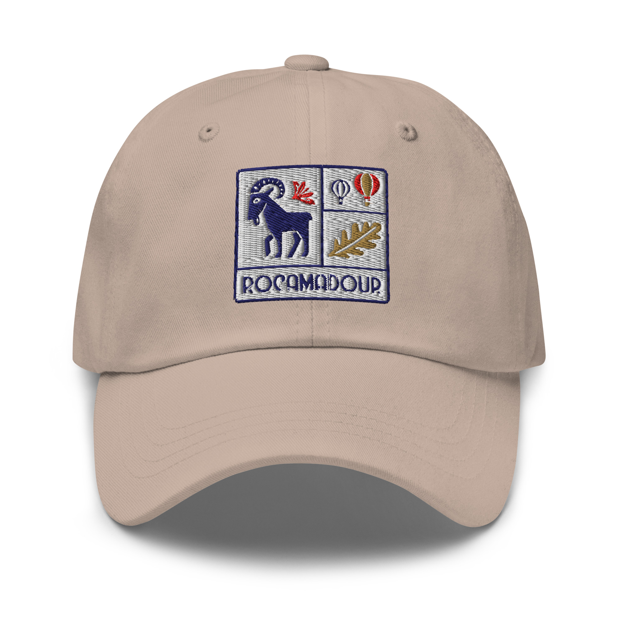 Ce visuel rassemble les symboles de Rocamadour (Lot, Occitanie) : pèlerin de Saint-Jacques-de-Compostelle, chèvre du Quercy, Vierge noire, singe de la Forêt des Singes, aigle du Rocher des Aigles et montgolfières des Montgolfiades. Composition inspirée des motifs artisanaux.
