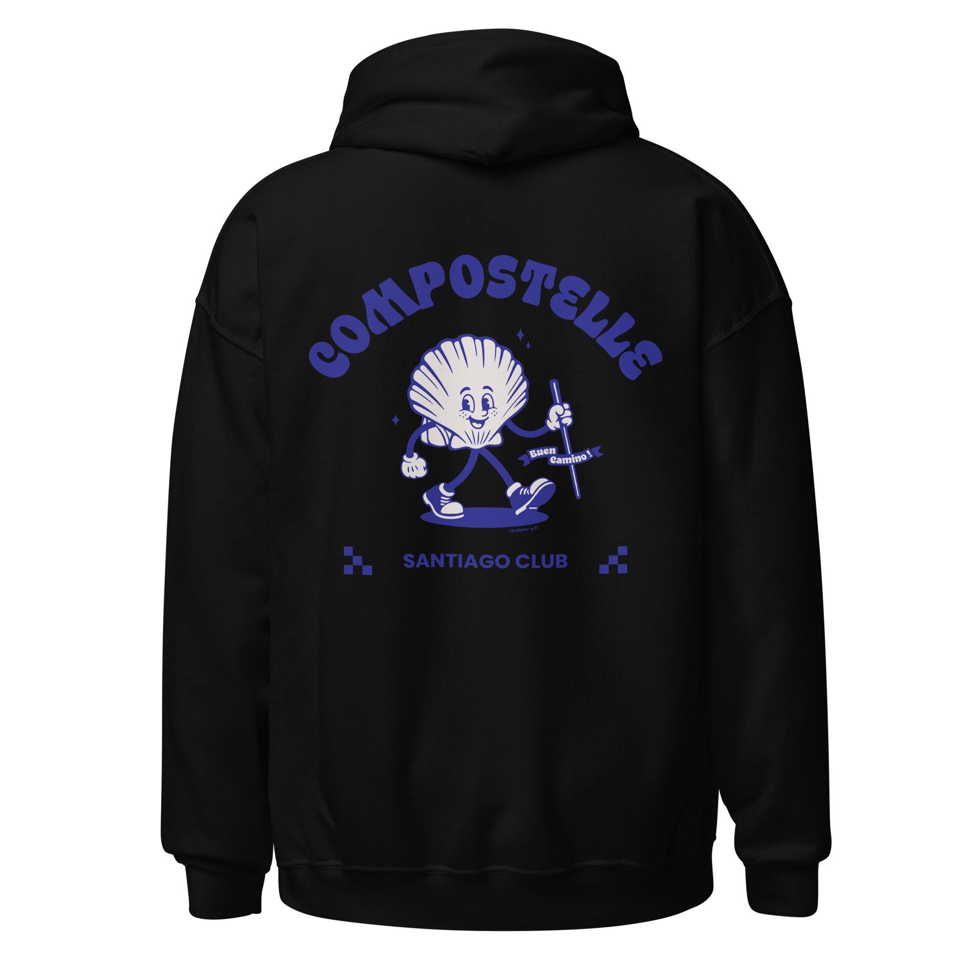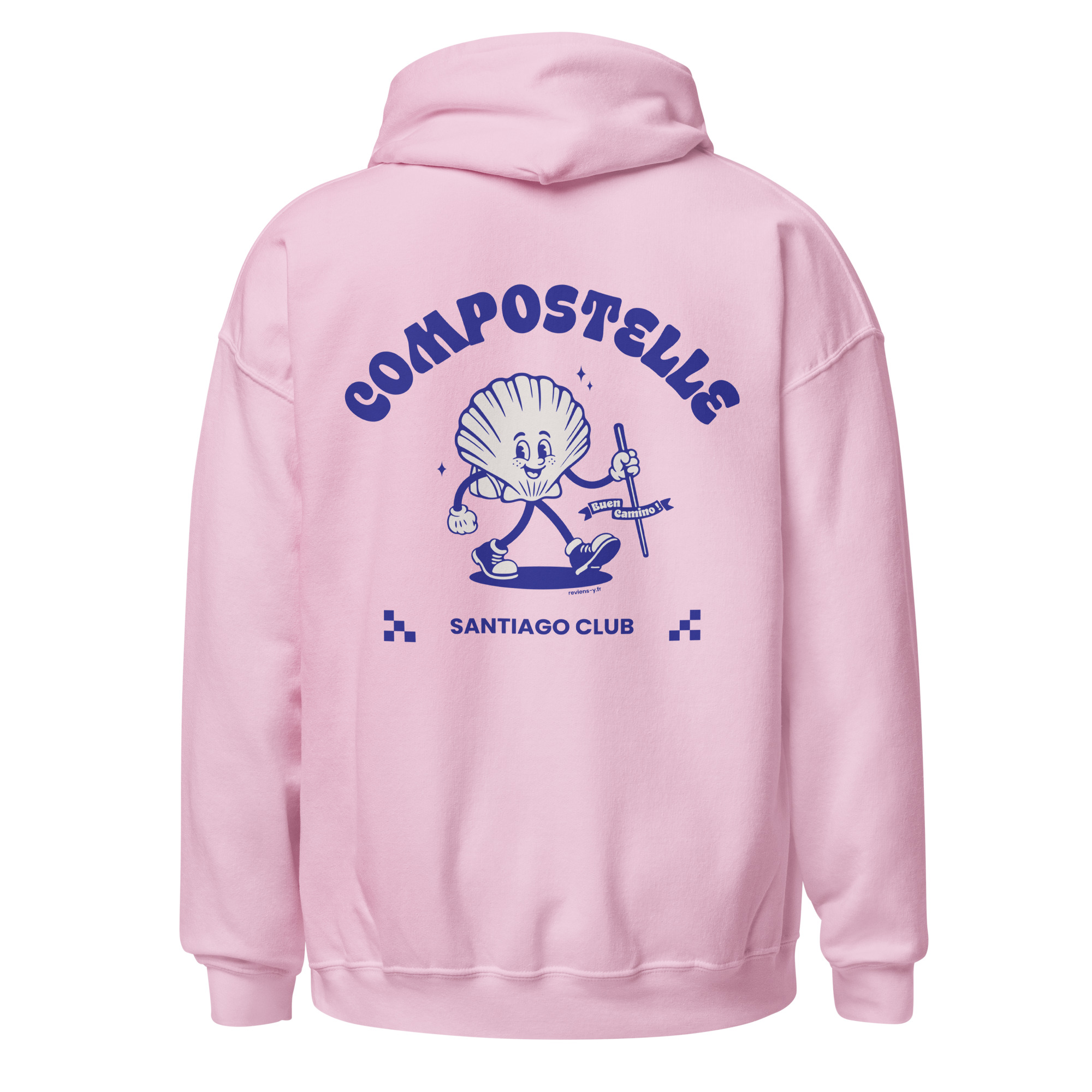 Craquez pour ce visuel rétro Compostelle ! Cette illustration vintage met en scène une adorable coquille Saint-Jacques mascotte en marche, arborant un style cartoon nostalgique. Avec son bâton de pèlerin et son joyeux message Buen Camino, ce design Santiago Club original célèbre le Chemin de Saint-Jacques avec une touche d’humour et d’authenticité.