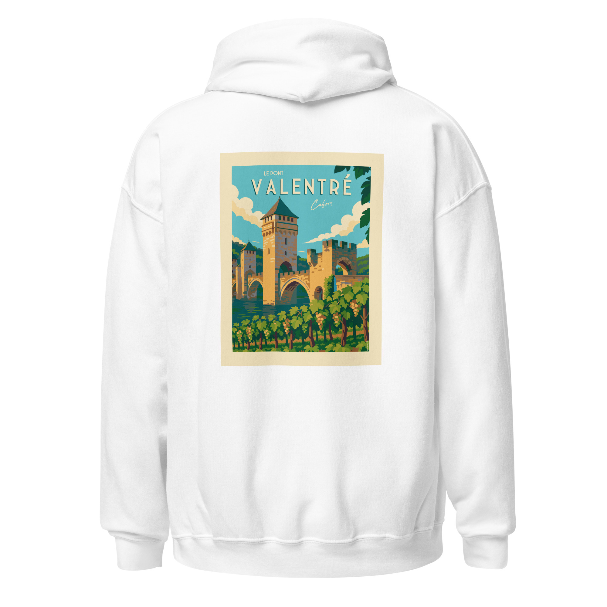 Symbole incontournable de Cahors, le Pont Valentré se dresse ici dans une illustration colorée et lumineuse. Ses tours médiévales et ses arches de pierre se reflètent dans le Lot, entourées de vignobles qui rappellent la richesse viticole de la région.