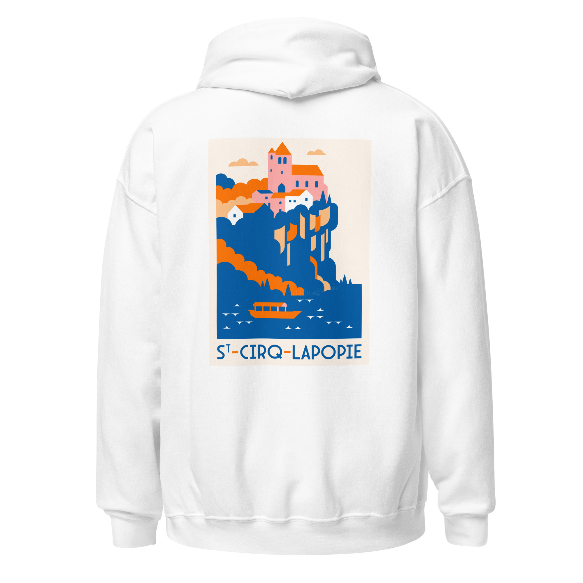 Ce visuel illustre Saint-Cirq-Lapopie dans une composition graphique minimaliste et colorée. Les falaises, la rivière et les maisons se dessinent en aplats contrastés, donnant une vision contemporaine d’un des plus beaux villages de France. La barque sur le Lot rappelle la vie fluviale et l’harmonie entre nature et architecture.