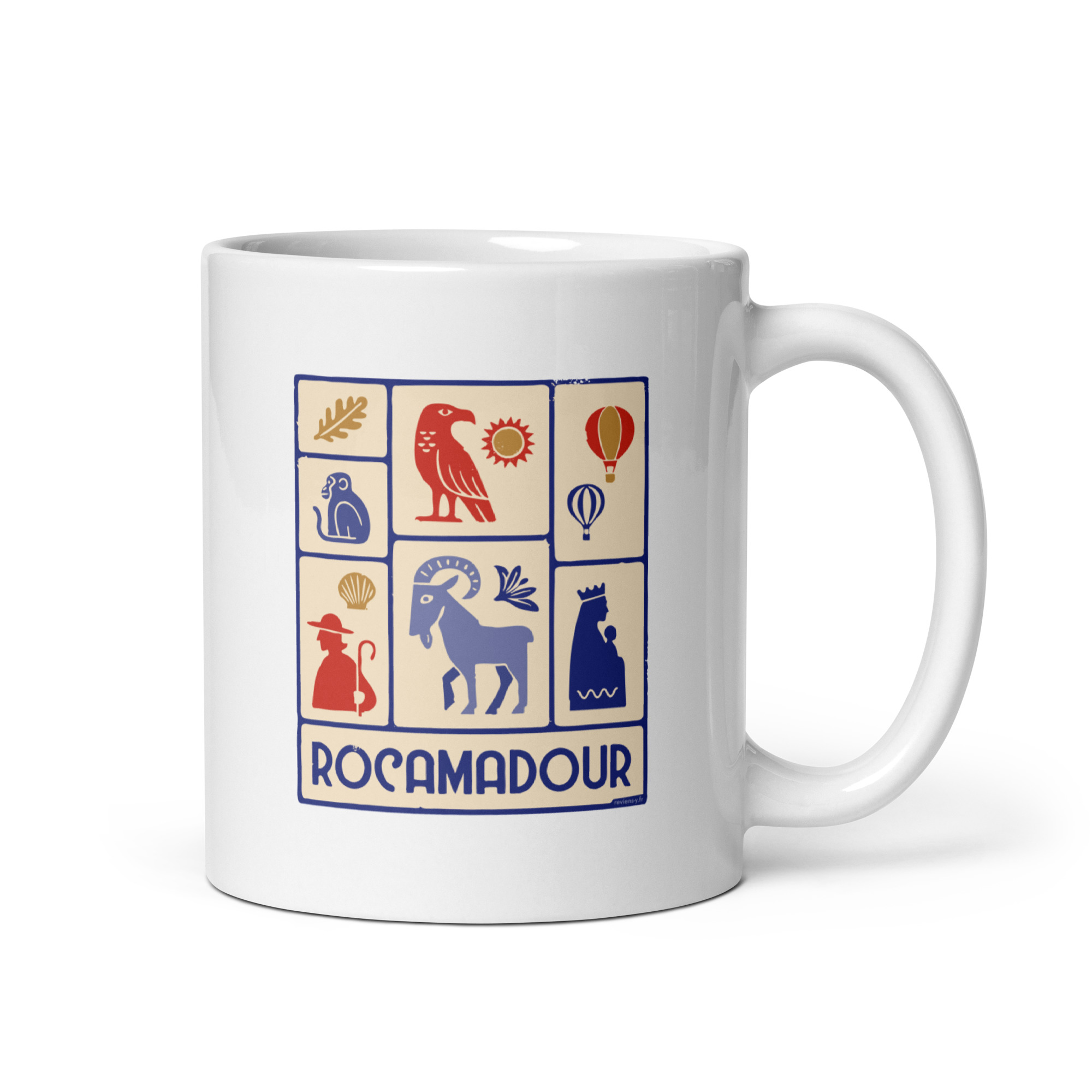 Ce visuel rassemble les symboles de Rocamadour (Lot, Occitanie) : pèlerin de Saint-Jacques-de-Compostelle, chèvre du Quercy, Vierge noire, singe de la Forêt des Singes, aigle du Rocher des Aigles et montgolfières des Montgolfiades. Composition inspirée des motifs artisanaux.