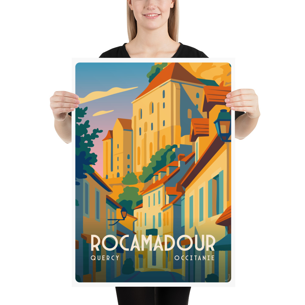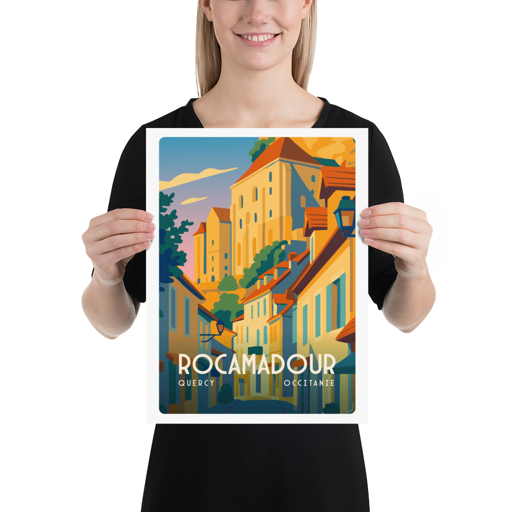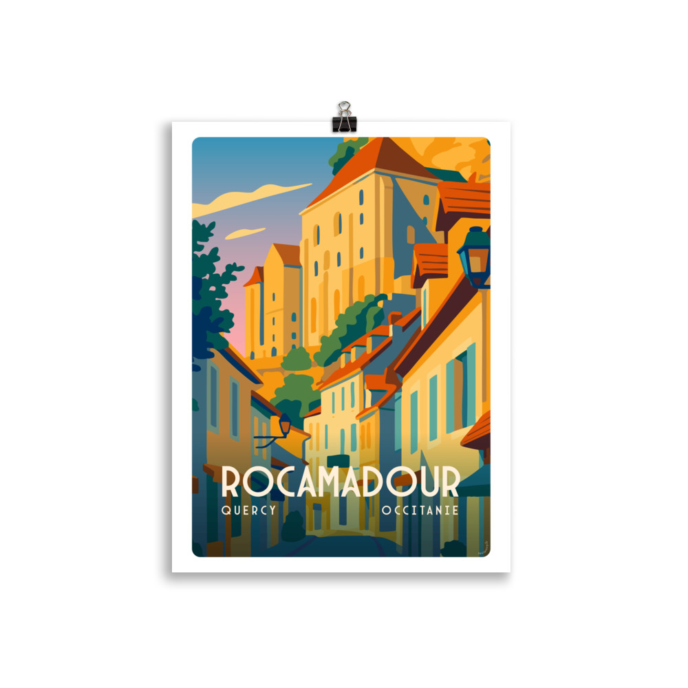 Ce visuel capture l’atmosphère ensoleillée des ruelles de Rocamadour, au cœur du Quercy. Les façades dorées et les toits ocres reflètent la chaleur du Sud-Ouest, tandis que la lumière du soir sublime les pierres typiques du Lot.