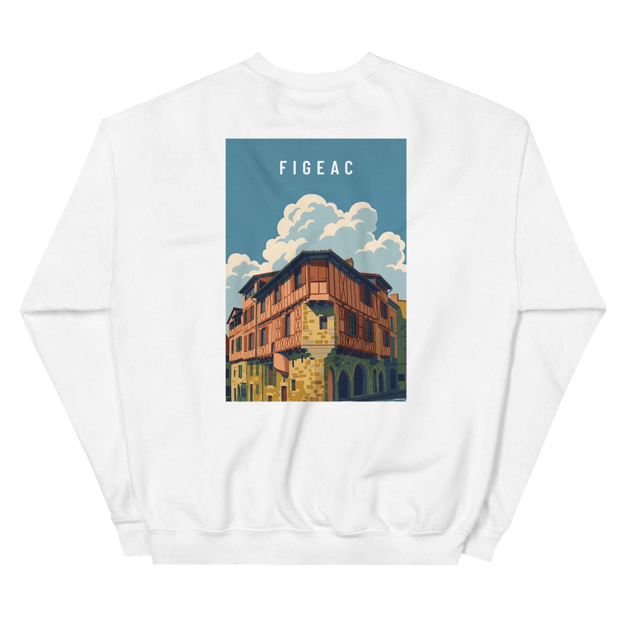 Illustration de Figeac au style graphique moderne, mettant en valeur une maison à colombages typique et l’architecture médiévale du Lot. Le traitement des formes et des couleurs souligne le relief, les matières et la lumière, offrant une interprétation contemporaine du patrimoine local.