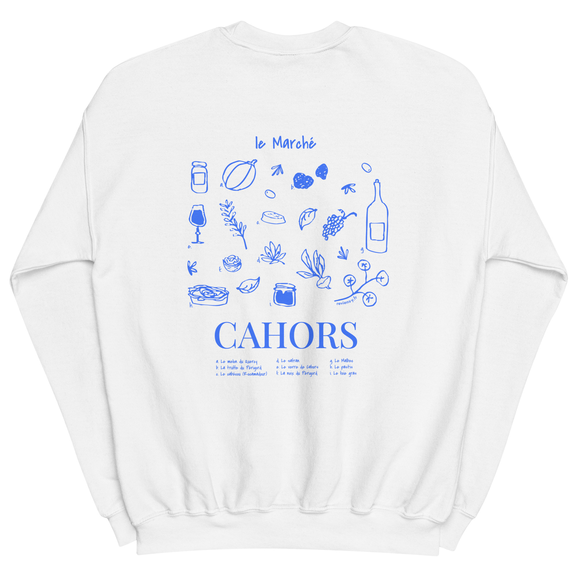 Ce visuel met à l’honneur les produits emblématiques du marché de Cahors et du Quercy. Illustrés dans un style graphique simple et monochrome, on y retrouve le melon du Quercy, la truffe du Périgord, le cabécou de Rocamadour, le safran, le verre de Cahors, la noix du Périgord, le Malbec, le pastis et le foie gras.