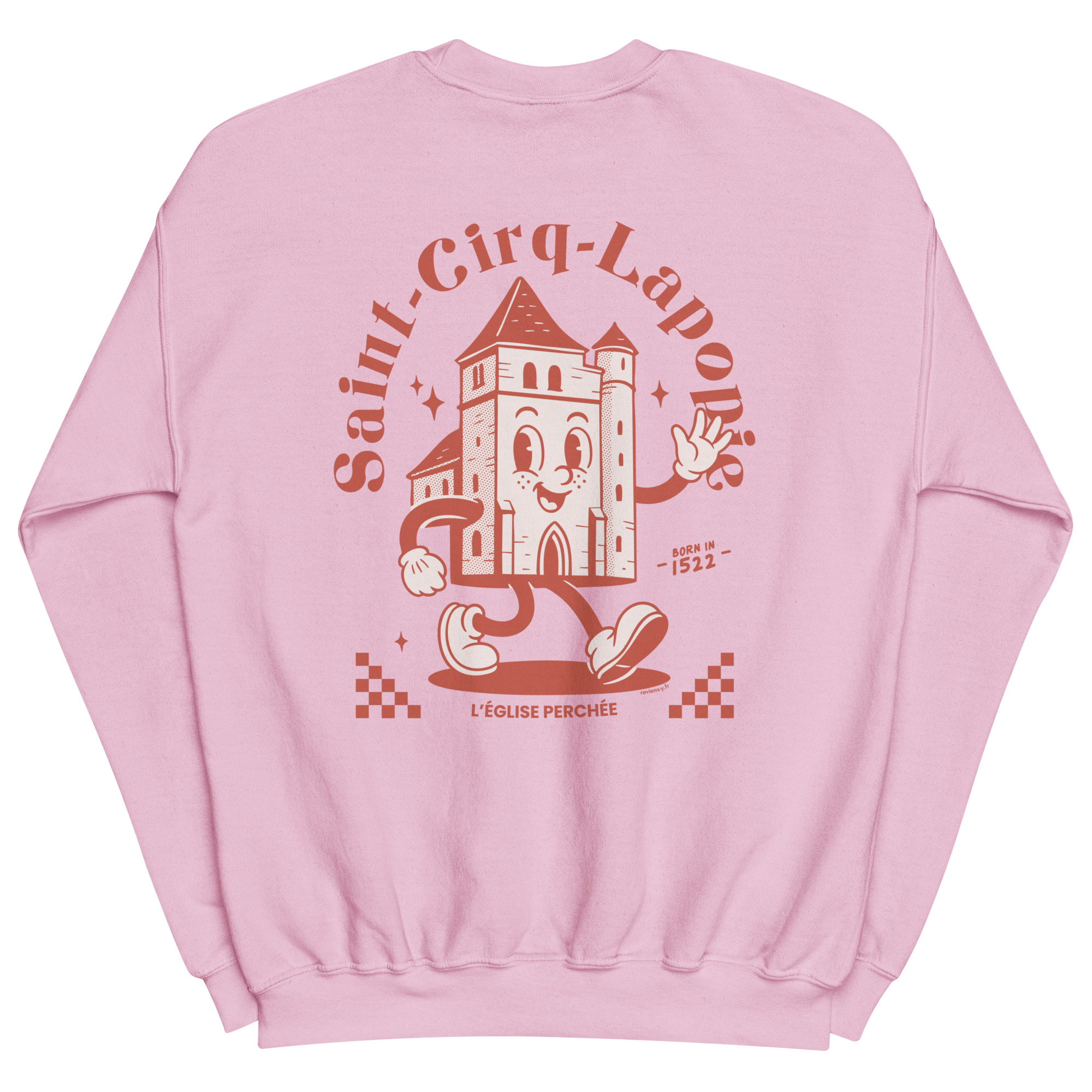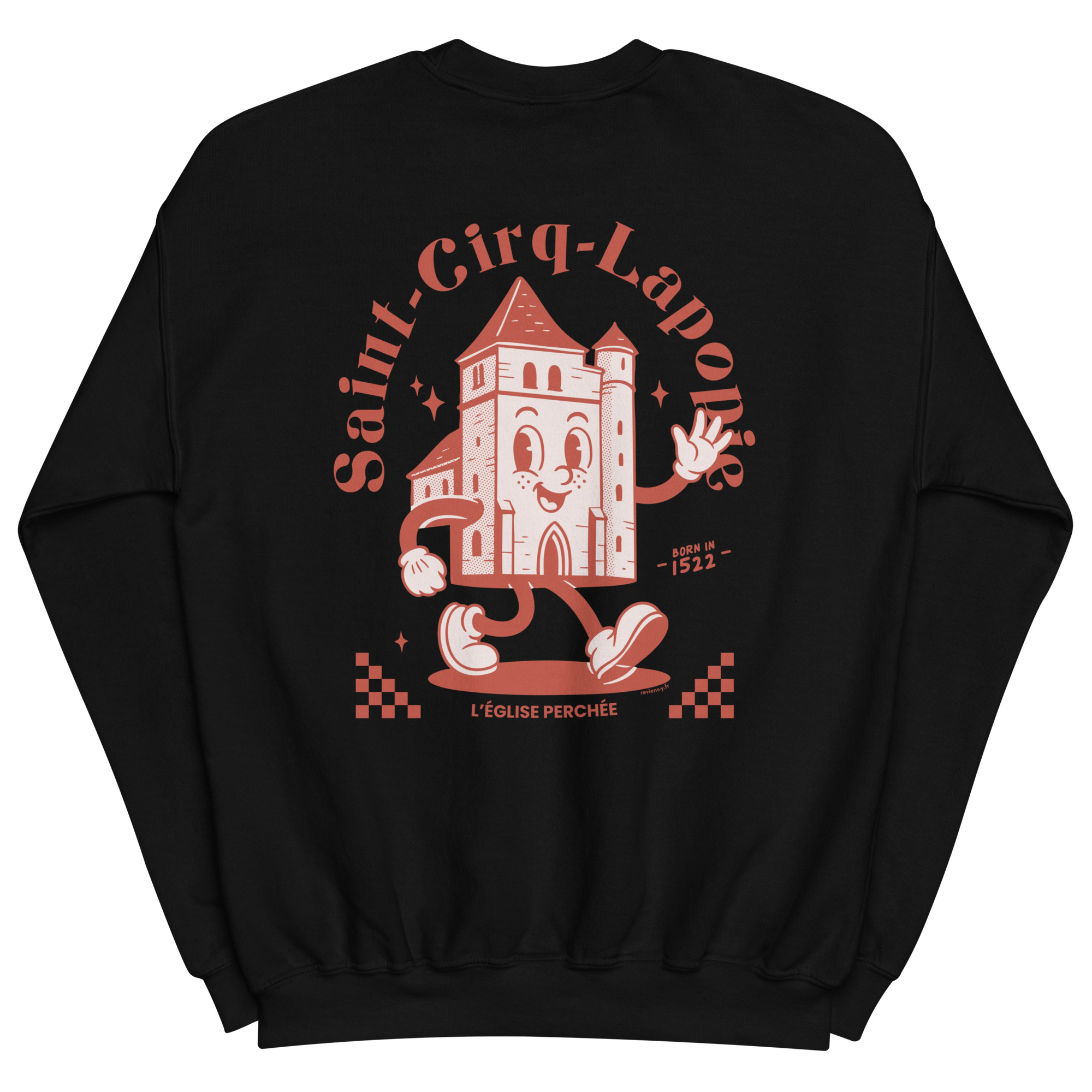 Ce visuel illustre l’église perchée de Saint-Cirq-Lapopie sous une forme ludique et vivante. Transformée en personnage souriant, elle prend vie avec des bras et des jambes en mouvement, offrant une interprétation originale et moderne d’un monument emblématique.