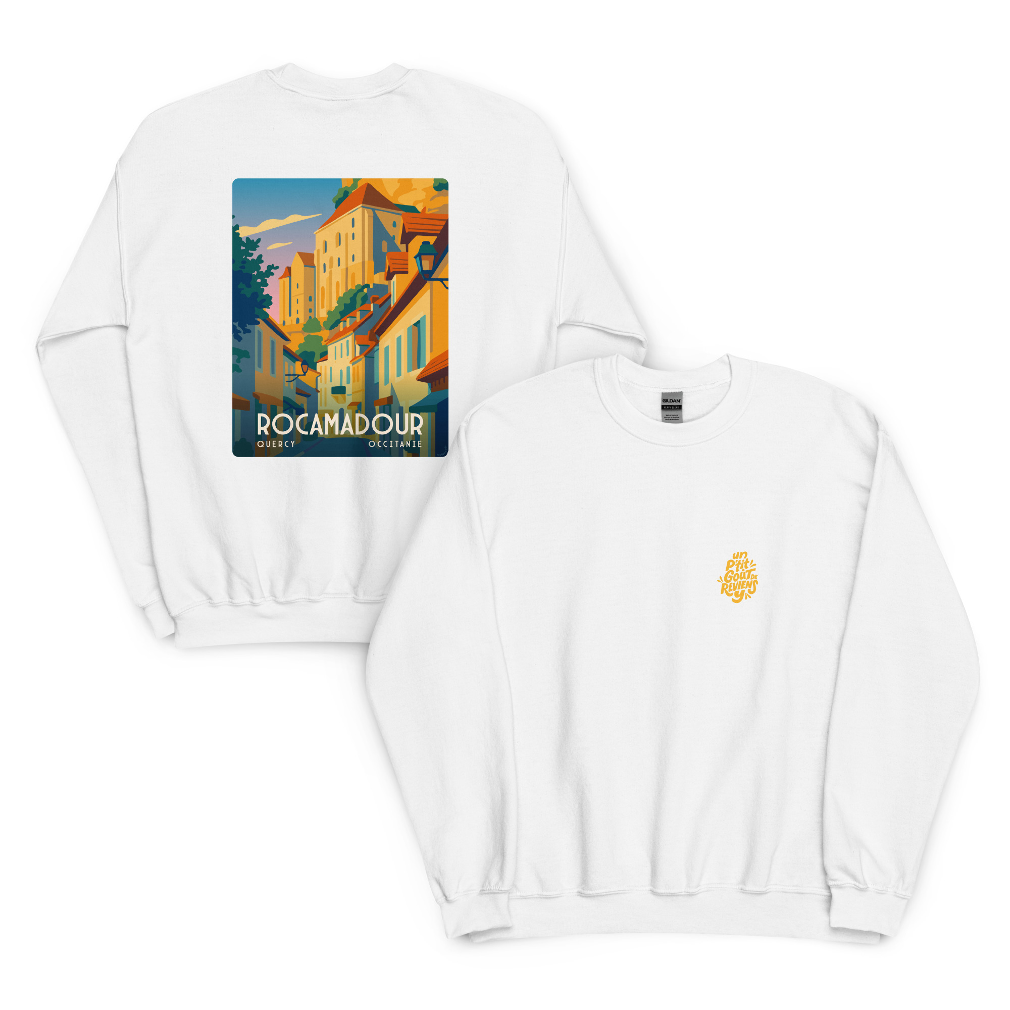 Ce visuel capture l’atmosphère ensoleillée des ruelles de Rocamadour, au cœur du Quercy. Les façades dorées et les toits ocres reflètent la chaleur du Sud-Ouest, tandis que la lumière du soir sublime les pierres typiques du Lot.