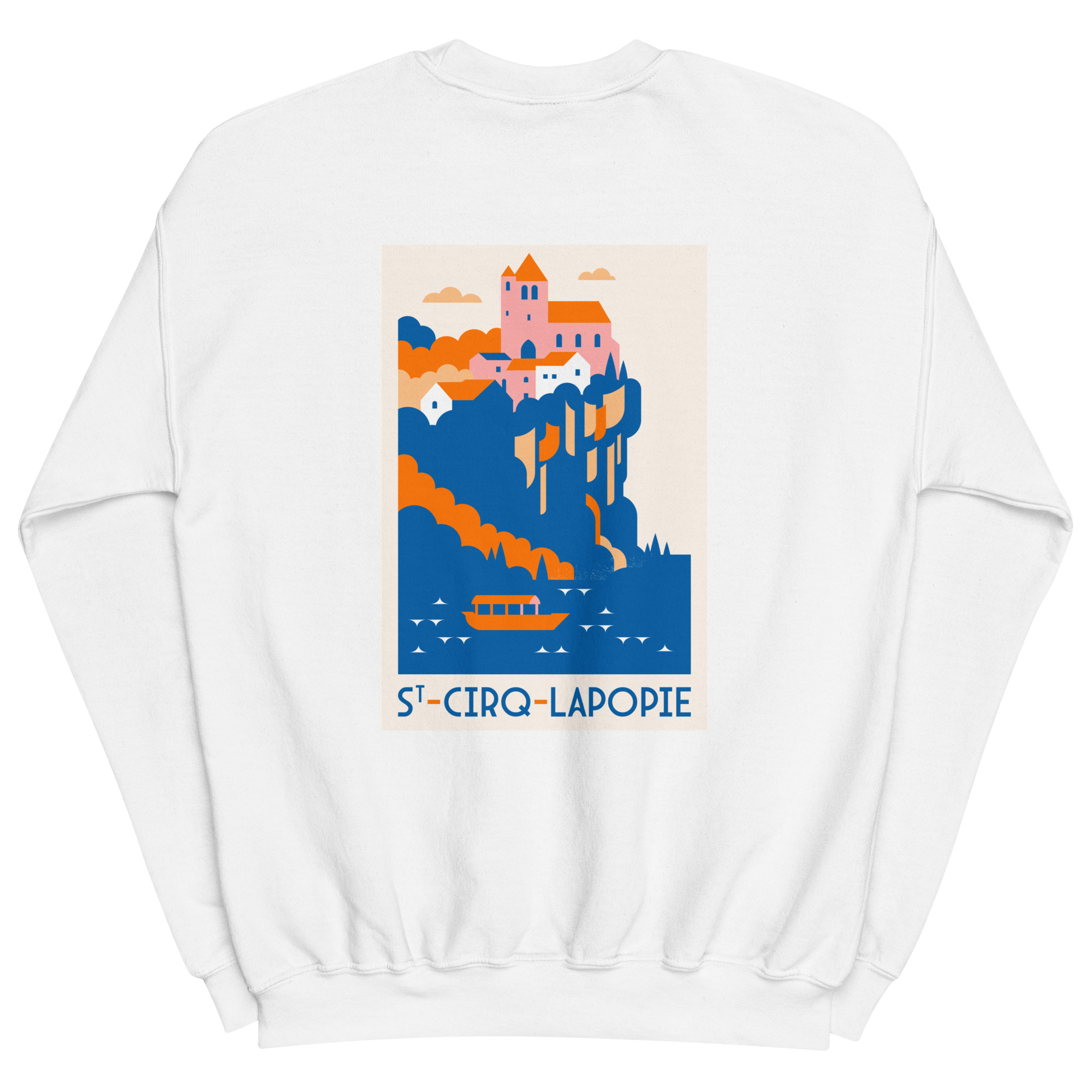 Ce visuel illustre Saint-Cirq-Lapopie dans une composition graphique minimaliste et colorée. Les falaises, la rivière et les maisons se dessinent en aplats contrastés, donnant une vision contemporaine d’un des plus beaux villages de France. La barque sur le Lot rappelle la vie fluviale et l’harmonie entre nature et architecture.