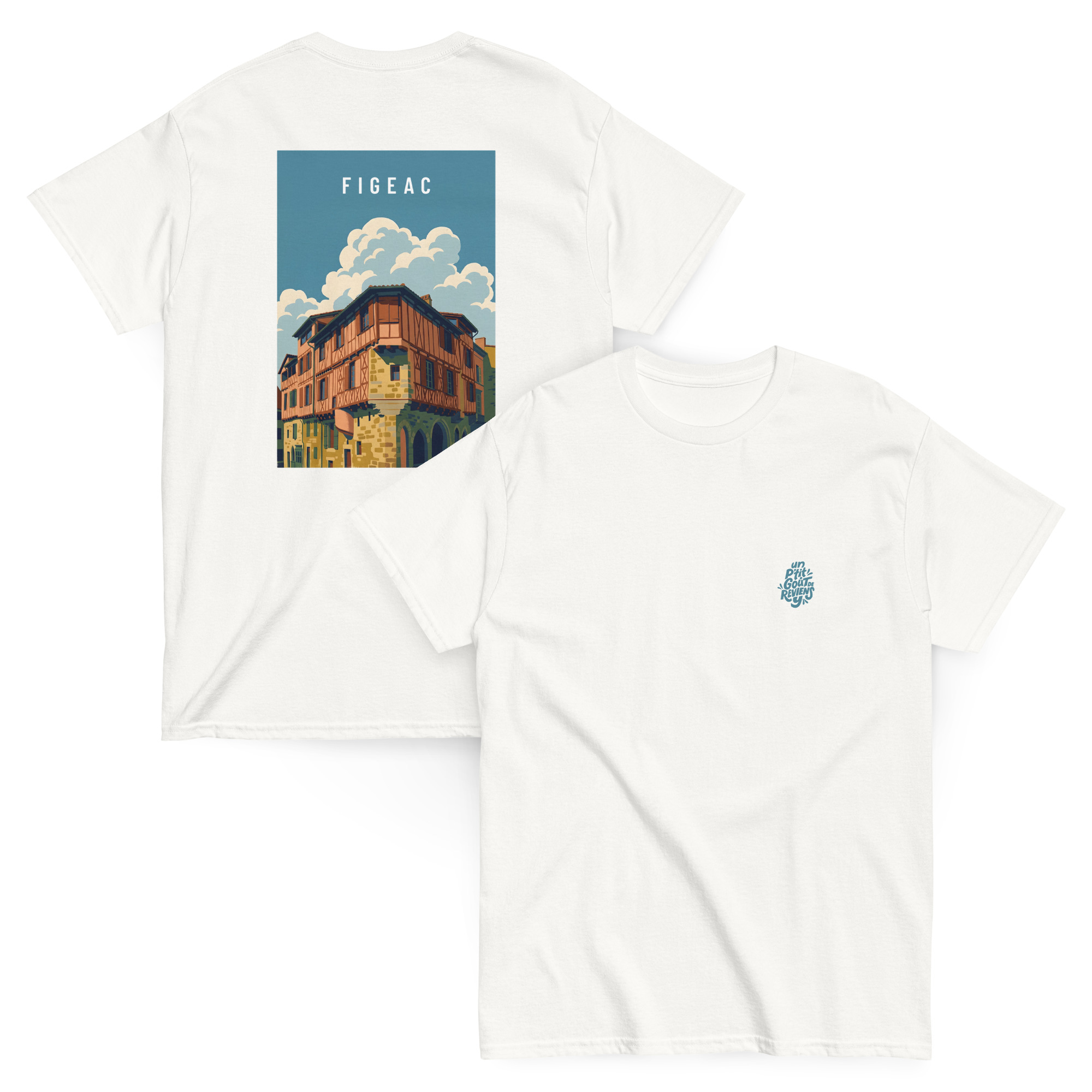 Illustration de Figeac au style graphique moderne, mettant en valeur une maison à colombages typique et l’architecture médiévale du Lot. Le traitement des formes et des couleurs souligne le relief, les matières et la lumière, offrant une interprétation contemporaine du patrimoine local.