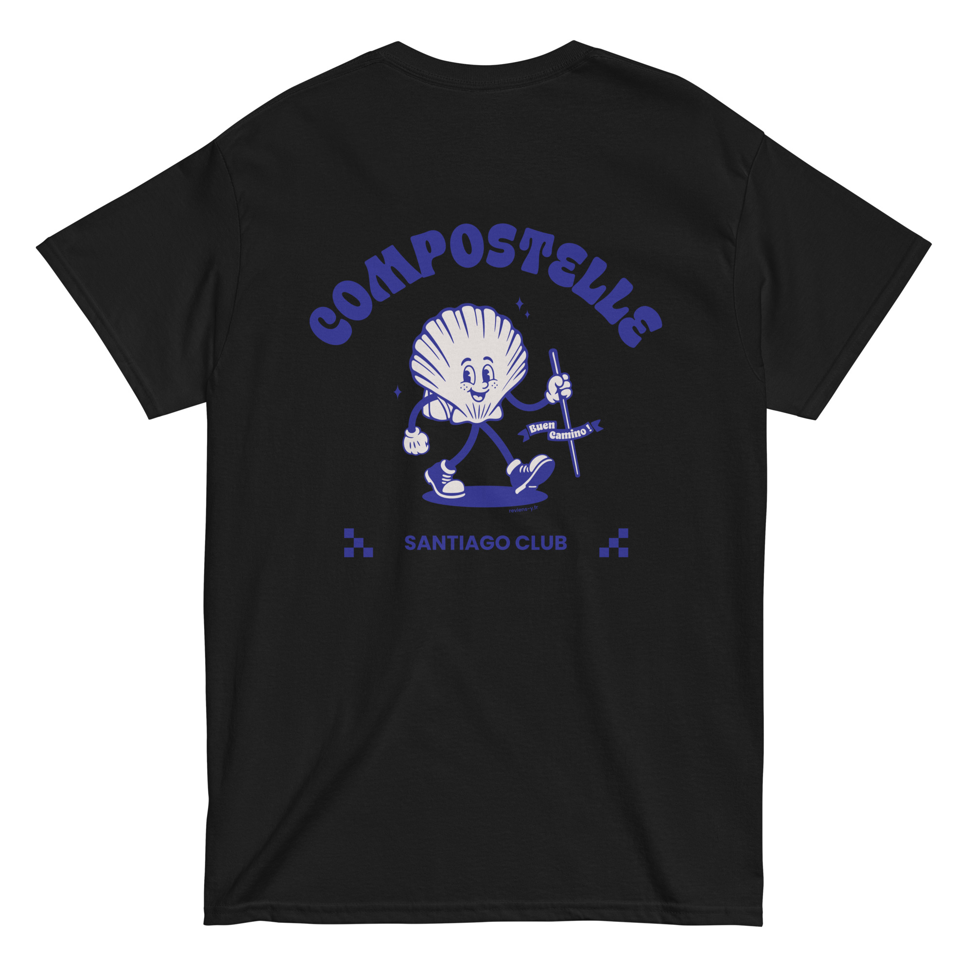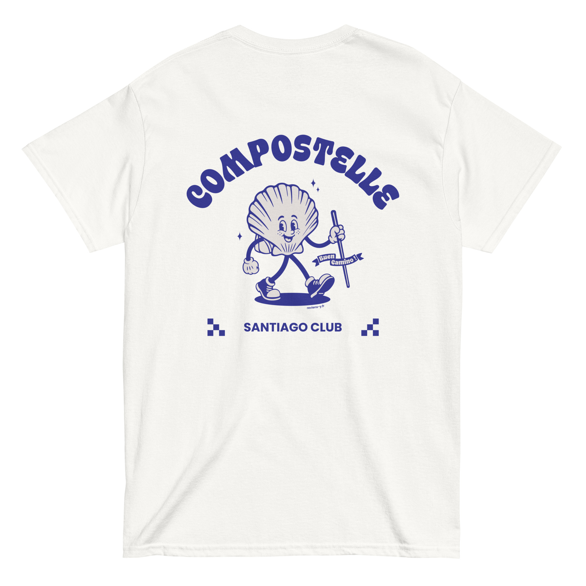 Craquez pour ce visuel rétro Compostelle ! Cette illustration vintage met en scène une adorable coquille Saint-Jacques mascotte en marche, arborant un style cartoon nostalgique. Avec son bâton de pèlerin et son joyeux message Buen Camino, ce design Santiago Club original célèbre le Chemin de Saint-Jacques avec une touche d’humour et d’authenticité.