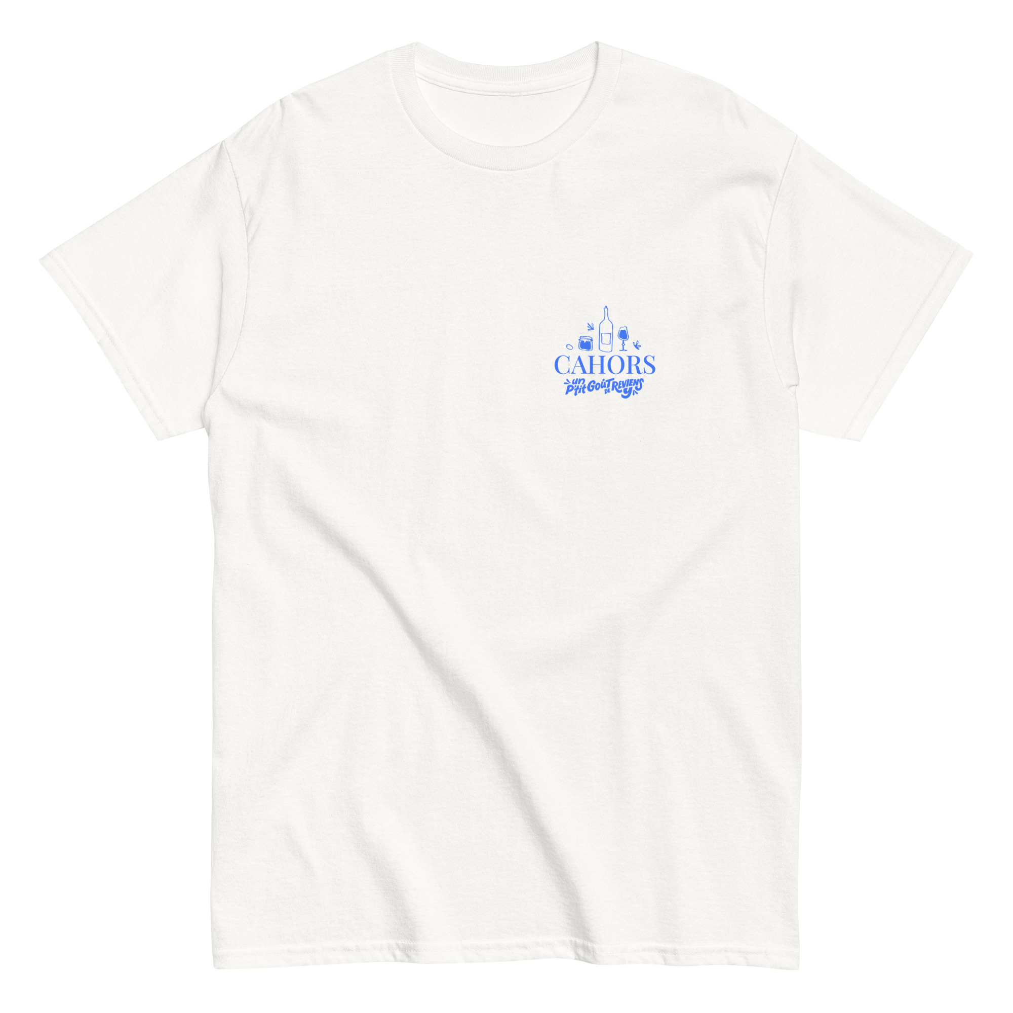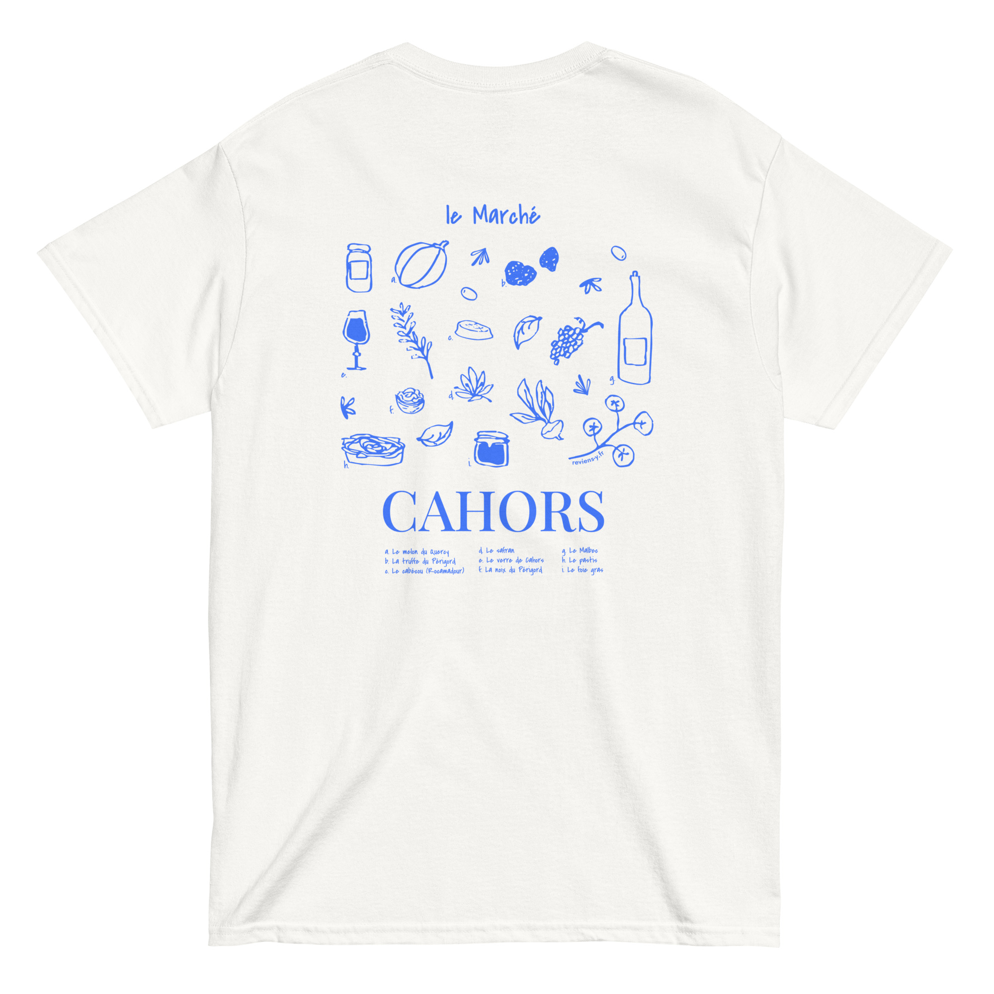 Ce visuel met à l’honneur les produits emblématiques du marché de Cahors et du Quercy. Illustrés dans un style graphique simple et monochrome, on y retrouve le melon du Quercy, la truffe du Périgord, le cabécou de Rocamadour, le safran, le verre de Cahors, la noix du Périgord, le Malbec, le pastis et le foie gras.