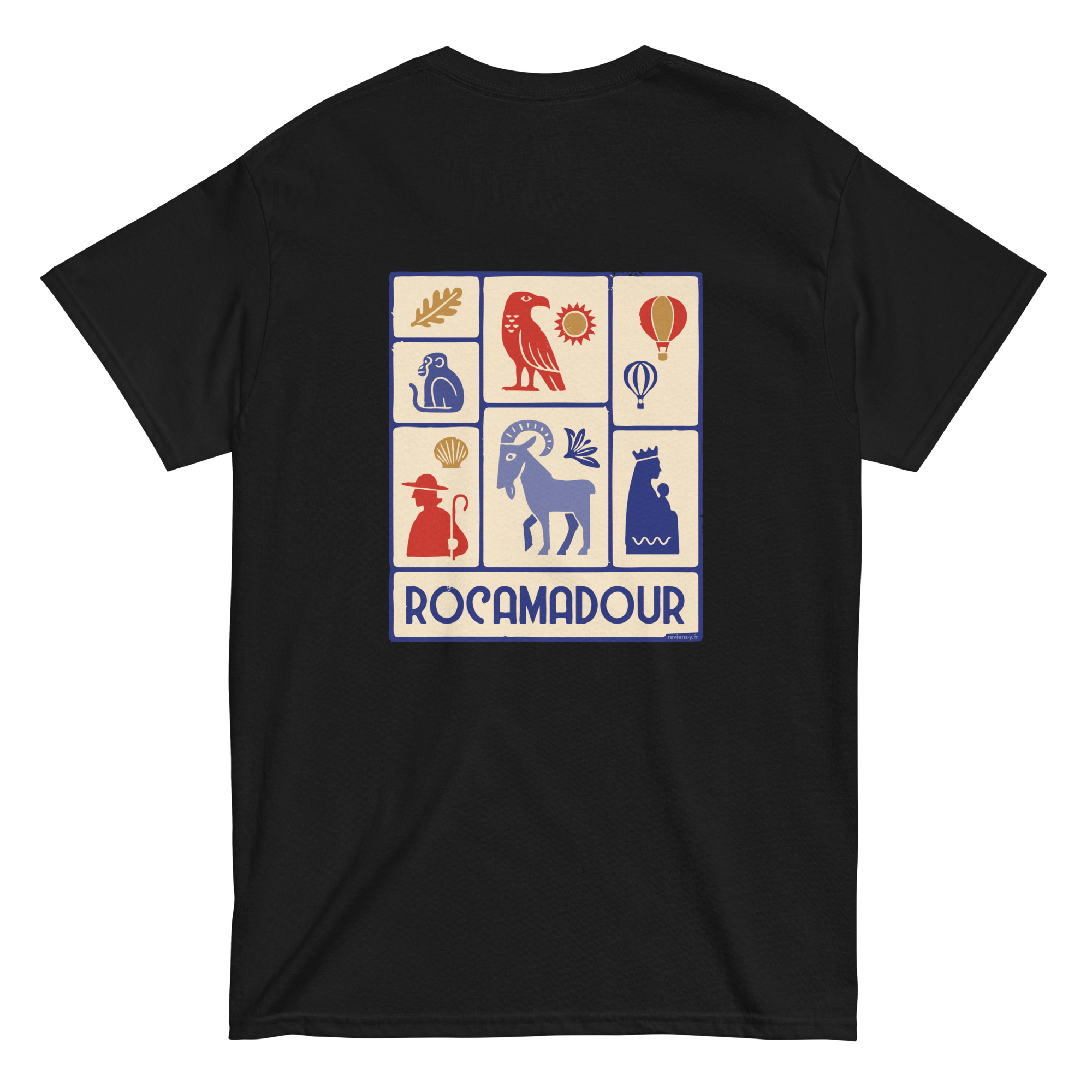 Ce visuel rassemble les symboles de Rocamadour (Lot, Occitanie) : pèlerin de Saint-Jacques-de-Compostelle, chèvre du Quercy, Vierge noire, singe de la Forêt des Singes, aigle du Rocher des Aigles et montgolfières des Montgolfiades. Composition inspirée des motifs artisanaux.