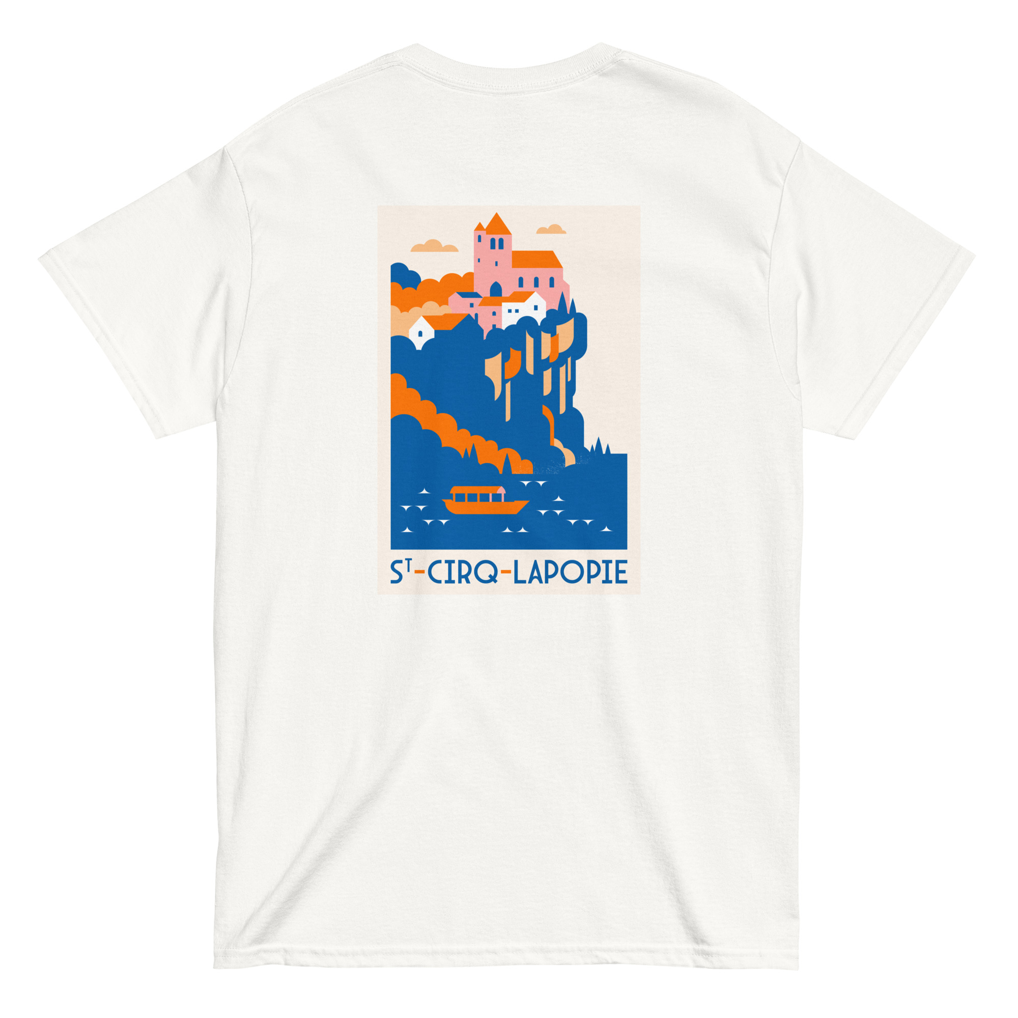 Ce visuel illustre Saint-Cirq-Lapopie dans une composition graphique minimaliste et colorée. Les falaises, la rivière et les maisons se dessinent en aplats contrastés, donnant une vision contemporaine d’un des plus beaux villages de France. La barque sur le Lot rappelle la vie fluviale et l’harmonie entre nature et architecture.