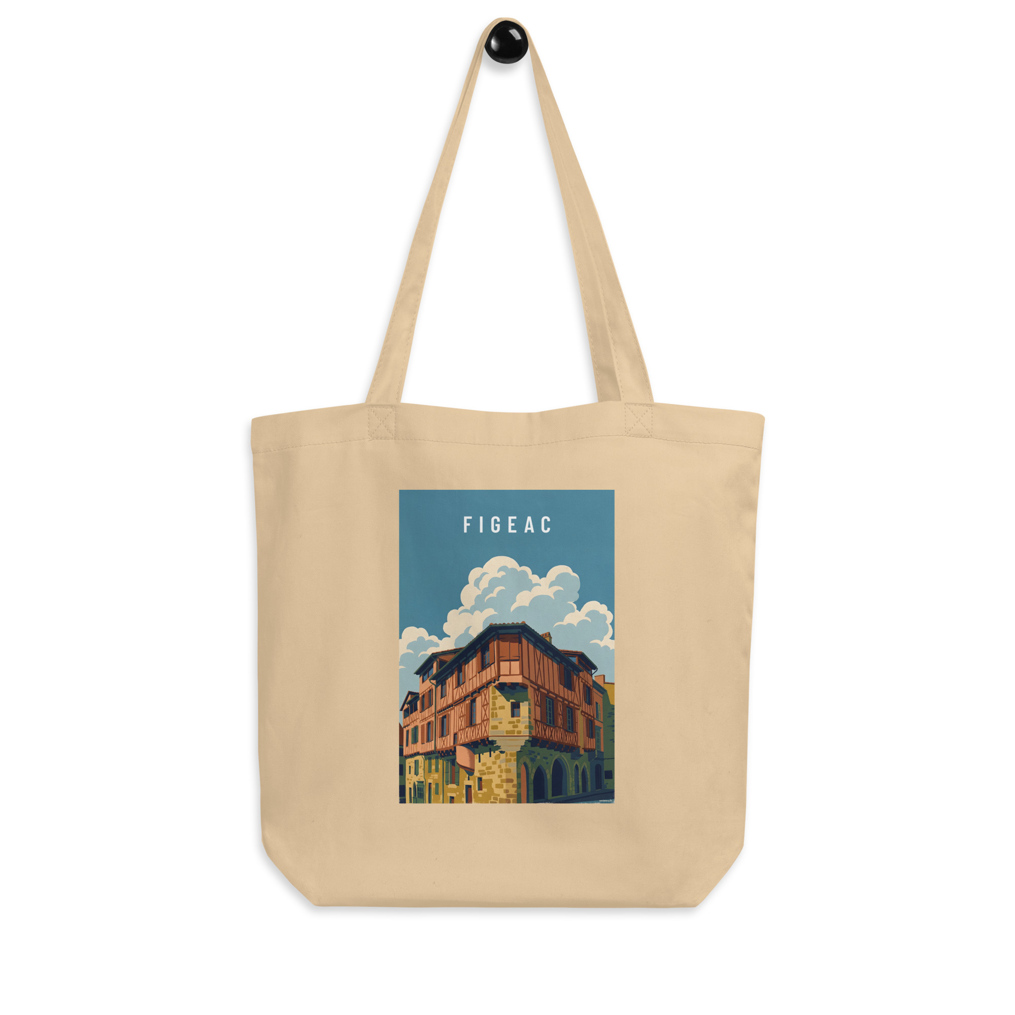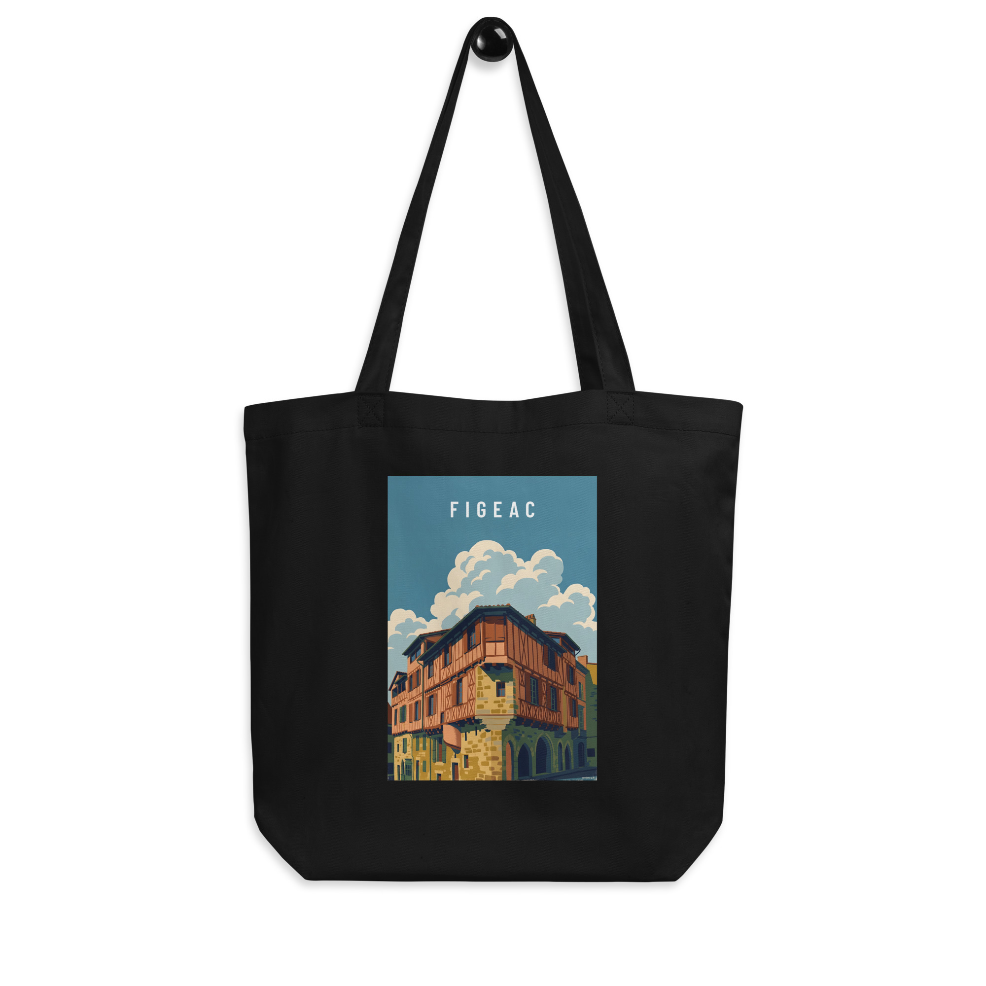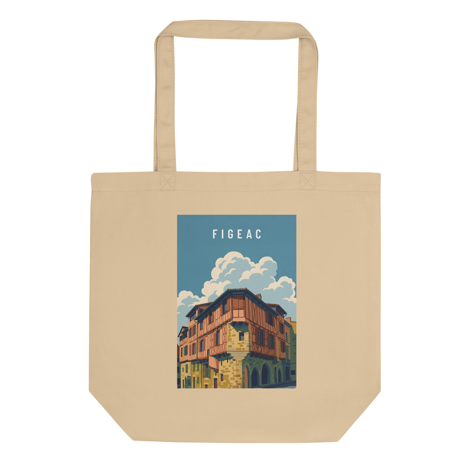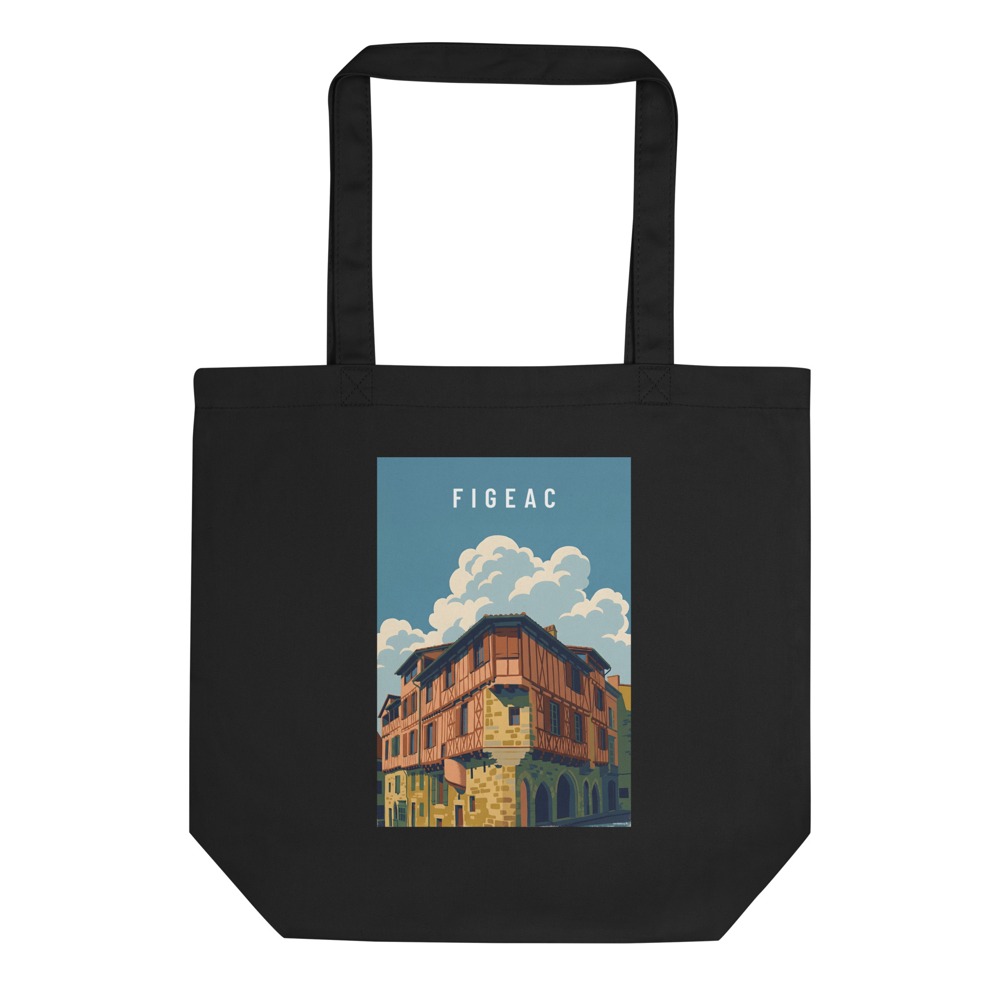Illustration de Figeac au style graphique moderne, mettant en valeur une maison à colombages typique et l’architecture médiévale du Lot. Le traitement des formes et des couleurs souligne le relief, les matières et la lumière, offrant une interprétation contemporaine du patrimoine local.