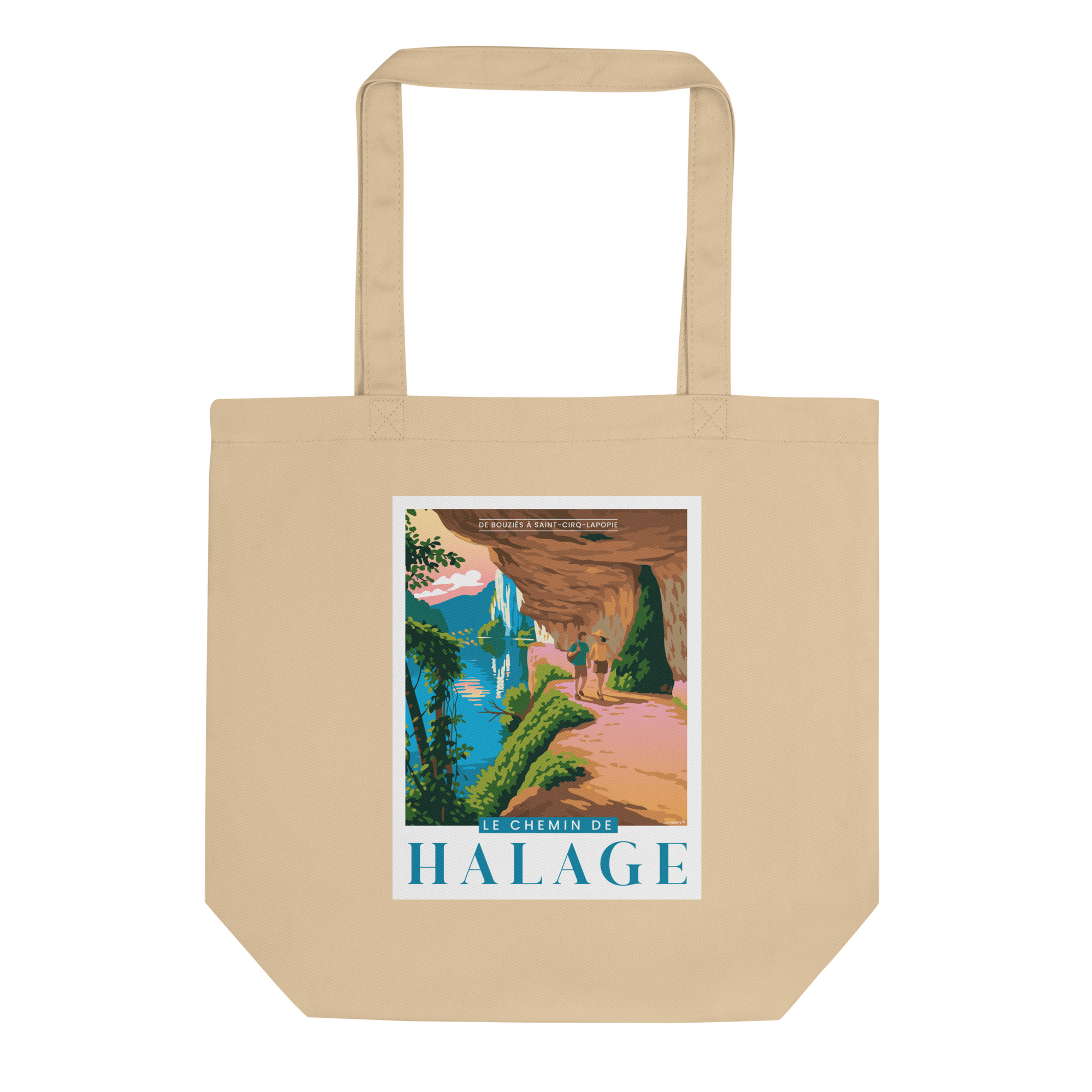 L’illustration met en lumière le célèbre chemin de halage, creusé dans la falaise au bord du Lot. On y voit deux randonneurs profiter de ce sentier unique, entre paroi rocheuse sculptée et reflets colorés de la rivière. La scène évoque une promenade immersive, où nature et patrimoine se rencontrent.
