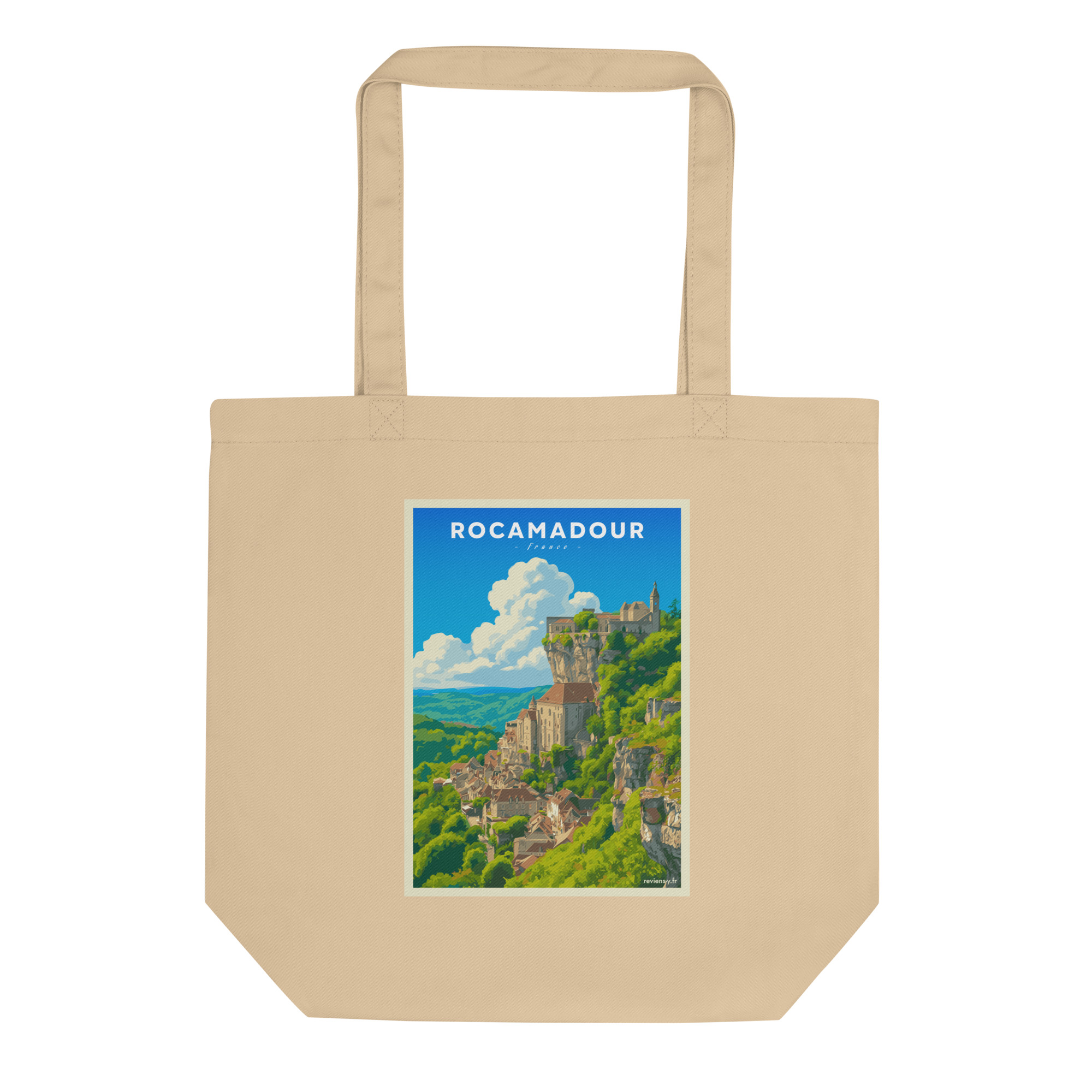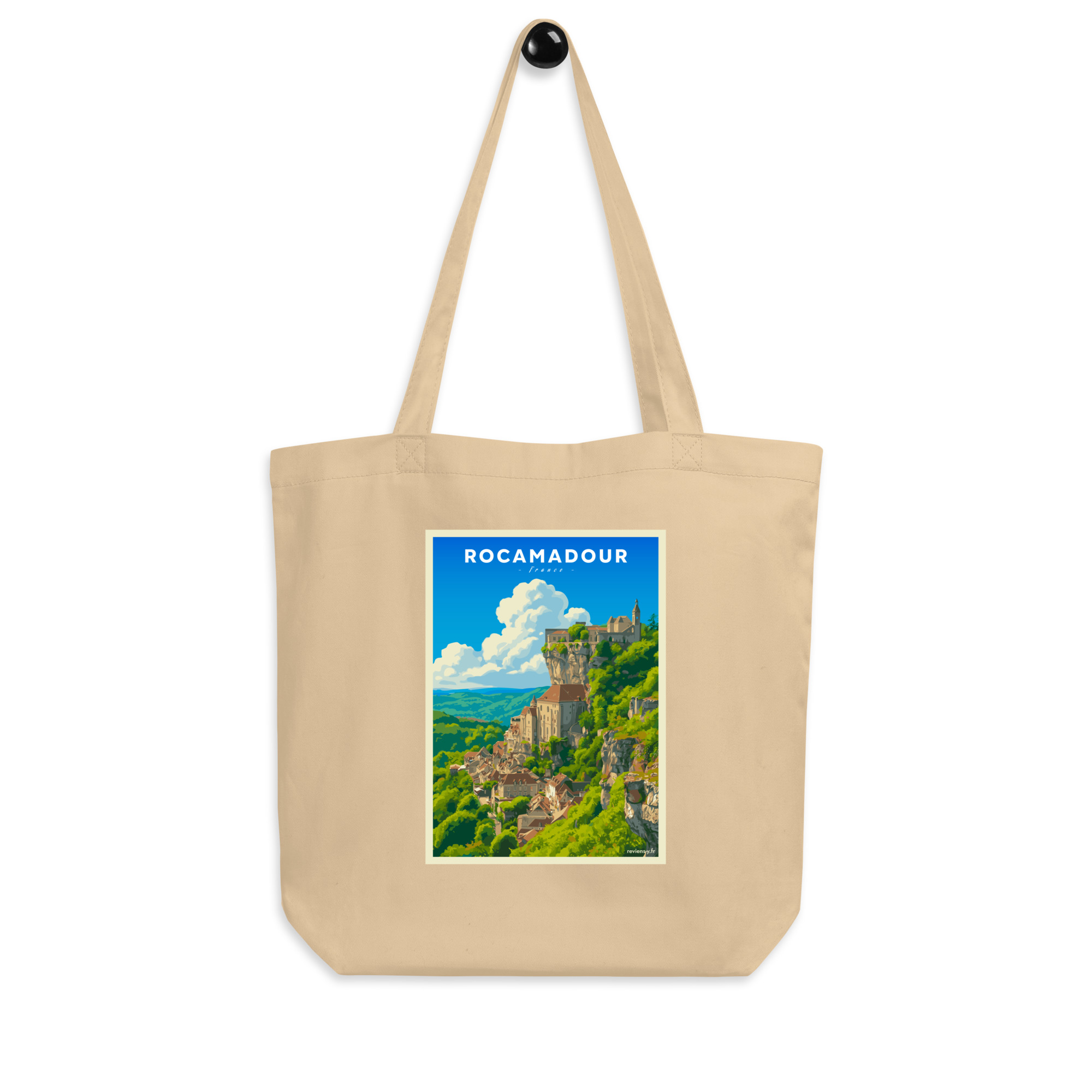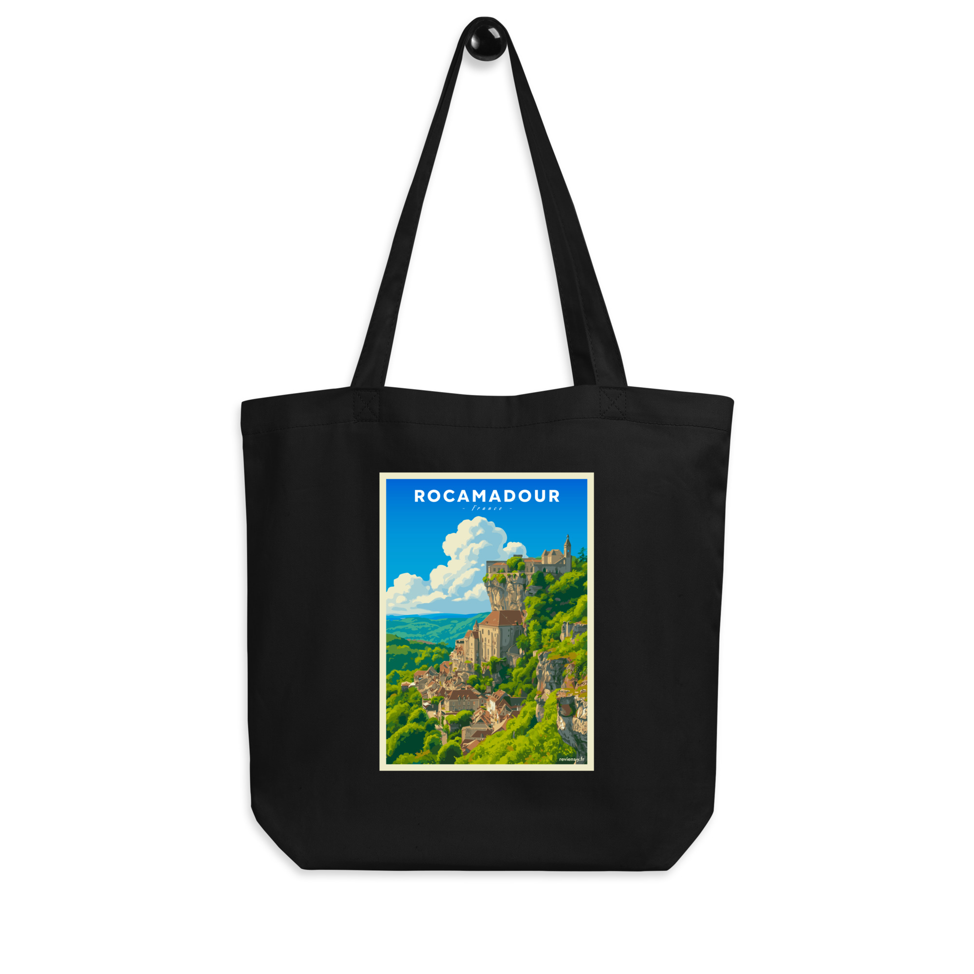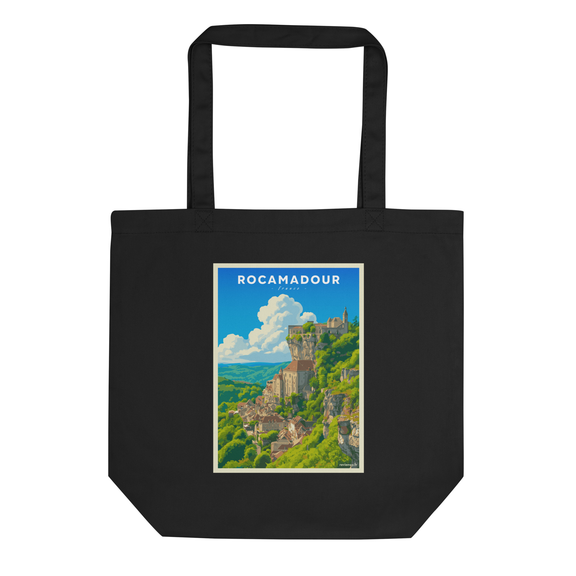 Ce visuel capture toute la majesté de Rocamadour, perché sur sa falaise surplombant la vallée de l’Alzou. Son style graphique, inspiré des affiches vintage, met en lumière l’un des plus beaux villages du Lot et d’Occitanie, entre nature préservée et patrimoine médiéval.